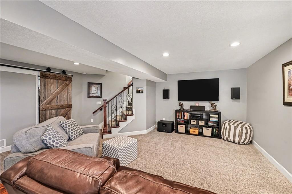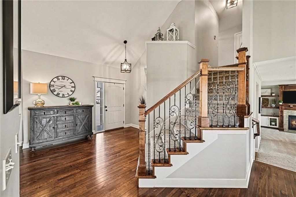 Welcome to 17802 Grey Hawke Ridge. Upon entry, you are greeted by beautiful wood floors and a bright living room filled with natural light. The dining room continues the airy feel with additional windows and flows seamlessly into the kitchen, which features classic wood cabinetry, stainless steel appliances, and a walk in pantry. Vaulted ceilings throughout the main floor enhance the open and spacious feel of the home. This open concept layout continues into the light filled family room, complete with a custom fireplace and built in shelving, making it the perfect space for gatherings with family and friends. The main level is complete with a convenient half bath for guests and access to the three car garage. Upstairs, you will find three bedrooms, including one with a walk in closet. The primary suite offers a private ensuite bathroom with a soaking tub, separate shower, and its own enclosed water closet, along with a very large walk in closet. The upper level also includes a full bathroom with double sinks and a conveniently located laundry room. The lower level features a recreation room and a utility and storage room connected through a sliding barn door, adding charm and character to the space. Step outside to enjoy the covered back patio, perfect for hosting family and friends, overlooking a very spacious backyard that offers plenty of room for outdoor activities and entertaining.