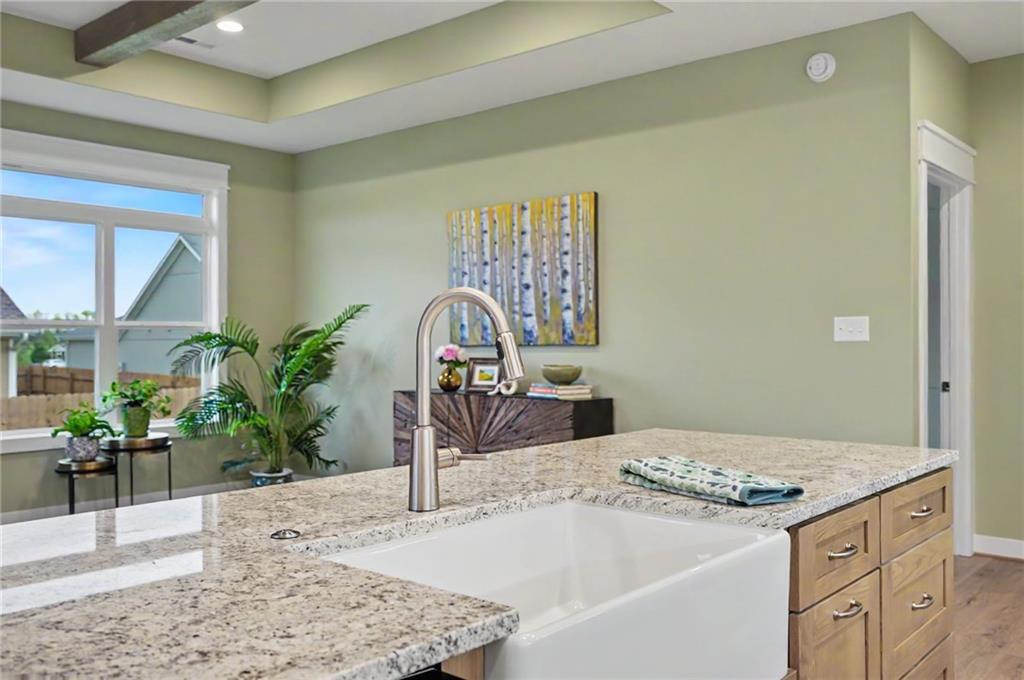 This impeccably built 3 bedroom, 1 and ¾ bath home offers 1,805 sq ft of comfort, quality, and timeless style. A welcoming wainscoted entry, designer interior doors, and quality finishes throughout elevate the home’s character. The kitchen is both functional and inviting, featuring a large island with farmhouse sink, an impressive gas range, and a 47-decibel ultra-quiet stainless steel dishwasher, ideal for entertaining or everyday living. The open living room is anchored by a stunning natural native Kansas limestone fireplace surround, wood burning fireplace made easy with gas log lighter, accented by exposed timber beams that continue into the primary bedroom for a warm, rustic elegance. Retreat to the primary bedroom enhanced by a custom designed accent wall and coffered ceiling, en suite primary bath boasts a large walk-in closet, walk-in shower and double vanity. The generous laundry room with sink adds convenience and practicality. One level living complete with an insulated 3-car garage for added ease and storage. Sound insulation in living areas and bathrooms and an insulated perimeter floor slab enable year-round comfort and quiet living. This thoughtfully designed home offers modern amenities and quality construction; perfect for those seeking space, style, and serenity.