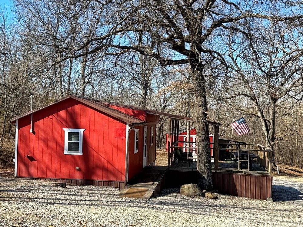 Complete Recreational Package: Land, Cabins, River, Trails, Hunting, Fishing. For sale just 3 miles west of El Dorado Springs, MO in Vernon County, is this 135-acre tract of the most prime recreational property around. This farm boasts 1.2 miles of Clear Creek frontage, scattered food plot fields on the south, timbered ridges on the north, and lush creek bottoms with a wetland slough that can be improved for duck hunting. The ~3-mile trail system on this property is fantastic with quick and easy access for ATV, UTV, and trucks. There are 2 cabins on the property. The first cabin is set at the main gate and is a 16’x24’, single room cabin with a kitchen, bathroom, and sleeping area. The cabin also has an outdoor shower, 14’x16’ covered deck, circle drive, firepit area, and 15’x20’ storage building with a 14’x20’ attached lean-to. The property is improved with rural (public) water, electric, small septic, and fiber internet (available). The second cabin is completely off-grid, sits on the northwest corner of the property, and is primitive in nature. The setting is on a bluff above Clear Creek surrounded by hardwood trees. This cabin is 16’x20’ with a large deck and firepit area. It showcases 1 large room with a kitchenette area, living room, wood stove, bathroom, and large-window views. A small solar system provides the electrical needs, and water can be hauled in for use. If you want a secluded cabin with an adventure, this is the place! Recreational properties with this location and improvements are rare to find, so call today to set up your private tour!