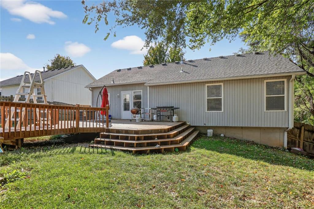 MOVE RIGHT IN! You’ll fall in love with this charming 3-bedroom (new carpet), 2-bath split-level that’s been meticulously cared for inside and out! Nestled next to green-space at the end of a quiet street, this home offers extra privacy and peaceful views. Enjoy your very own backyard oasis—complete with an above-ground pool, spacious 300 sq. ft. deck with boardwalk, Shed, and private fencing. Perfect for entertaining family and friends especially during the SUMMER while enjoying the above ground swimming pool! Inside, the kitchen and great room feel fresh and inviting with wood floors, fresh interior paint. A leaf guard system, and expanded 3rd-car driveway. Great location near World, Oceans of Fun, parks, shopping, and restaurants+++++++++++++++++++EVERYTHING YOU NEED JUST MINUTES AWAY.