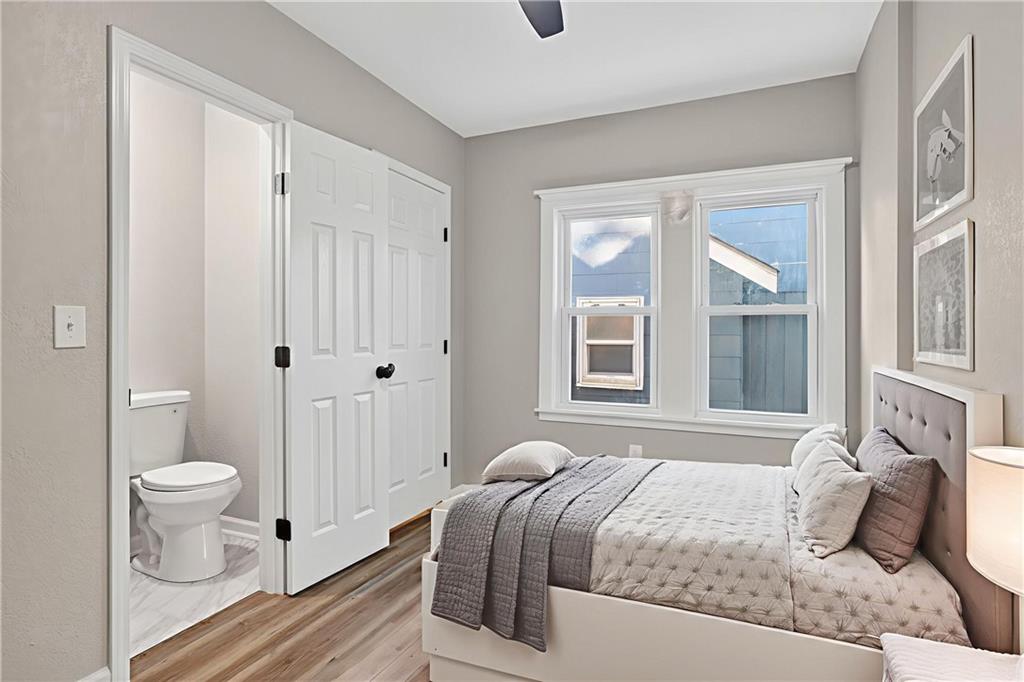 Completely rebuilt from the inside out, this fully renovated home delivers modern finishes and brand-new major systems for true peace of mind. This is not a cosmetic update — the HVAC, roof, windows, electrical, and plumbing are all brand new. The big-ticket items have been done. The main level features new luxury flooring, fresh neutral paint, and a bright open layout. The kitchen is fully updated with white shaker cabinets, sleek black hardware, stainless steel appliances, subway tile backsplash, and modern lighting. One bedroom includes its own private half bath — a rare and convenient feature. The beautifully finished basement adds valuable living space with a closet plus a full bathroom, making it perfect for an en suite bedroo, second living area, guest suite, office, or flex space. Outside, enjoy a fully fenced yard, off-street parking, and private rear access. With brand-new systems, designer finishes, and a finished lower level, this home offers style, function, and long-term value — all in one package.