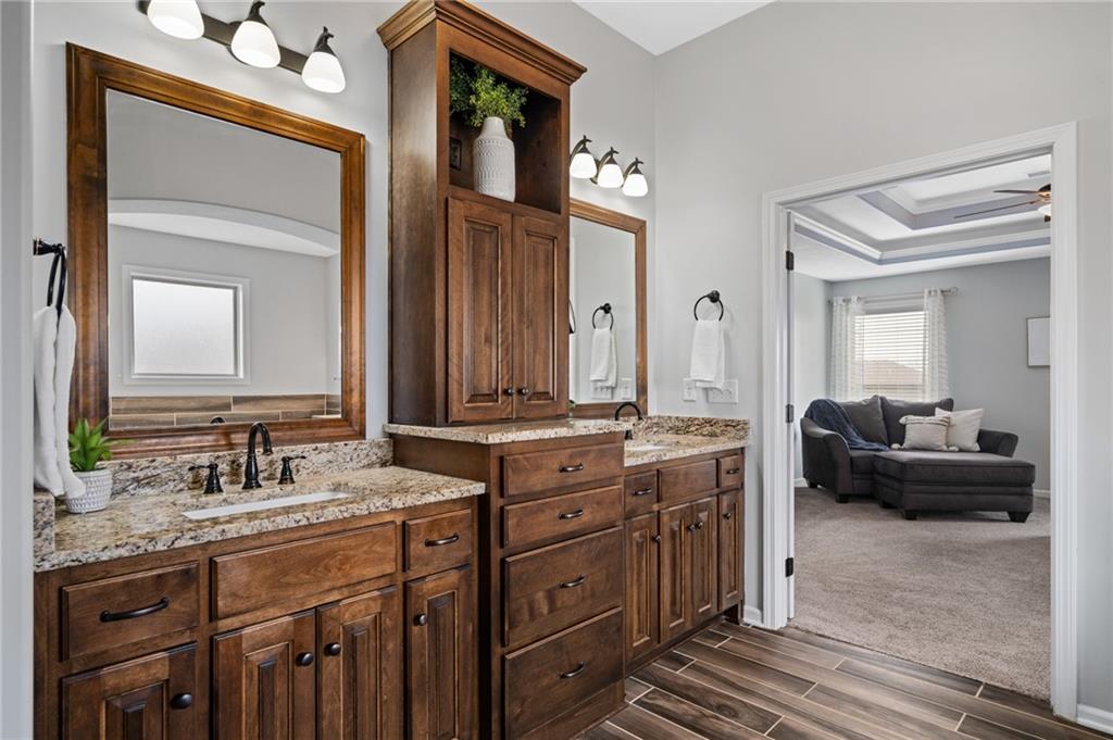 This show-stopping 5 bedroom/5 bath home is in the heart of south Olathe. Open spaces/open concept are theme of this home. The kitchen is set up perfectly for entertaining with walk-in AND butler's pantries adjacent to the large dining space and enormous living room (finally the space that fits EVERYONE). OR go out back, w/its covered patio, great for outdoor entertaining or watching the kids have plenty of space to run in the large, fenced yard. Tired from all the entertaining? Make your way upstairs to the well-appointed master suite, with its own covered deck! Soak in your huge tub, take a shower in the stand-alone shower, and no sharing with two large sinks and built in cabinets. Enjoy not one, but two closets with MORE built-ins including vanity/ dressing table. But, what about the kids? Don't worry, they will be thrilled with two additional bedrooms sharing jack-n-jill bathroom and 3rd bedroom with its own on-suite all on the second floor. No more fighting over bathrooms! This house isn’t done showing off…head downstairs to a finished basement with built-ins galore, bar area, along with a full bath and 5th true bedroom! Oh, and ALL bedrooms have WALK-IN closets! But having 5 bedrooms doesn't mean you give up office space; there is a dedicated office on the main floor! 3-car garage will wow you with its extra-long drive, full driveway for that 3rd car (no more running over the grass), 23' depth bay (that truck/large SUV doesn't have to sit outside), and 220-outlet ready for an EV charger! Being in the Springhill School District allows your kids to enjoy a smaller district with all the benefits of living in the city. Only 15 min WALK (~1/2 mile) to assigned Springhill Elementary AND Middle Schools OR less than 8 min drive to TWO private school options. Stonebridge amenities include FOUR pools, FOUR playgrounds, tennis & pickleball courts, clubhouse, fitness center, AND miles of walking trails! Not only a new home; but a lifestyle upgrade!