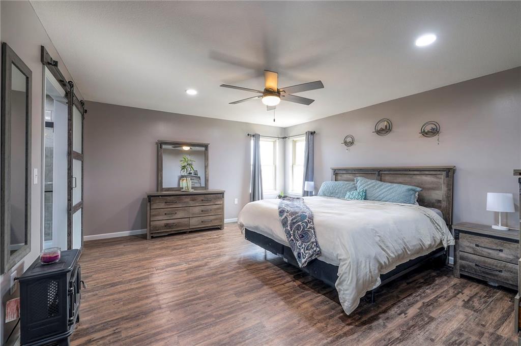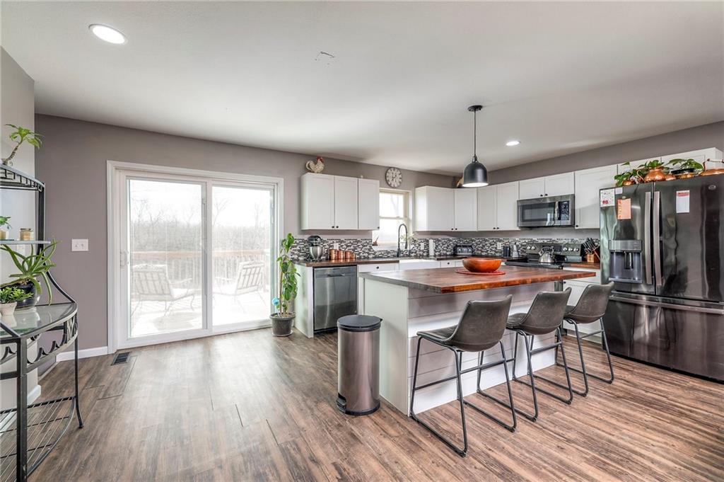 Imagine your perfect country home. Do you see yourself sitting high above your own pond, watching ducks lazily circle before landing? Picture gazing at the tree line as deer emerge in the early evening, or neighbors passing by in a horse and buggy rather than a pickup truck. Have you dreamt of a manicured yard, a new fruit orchard, or a 2,800 sq. ft. outbuilding with utilities? Is your ideal home perched on a high spot with views for miles in every direction? If so, this is your dream come true! This beautiful 15.7-acre property only minutes from Whiteman AFB features rolling terrain, a stunning stocked pond, and a stream winding through the land. Enjoy open spaces, breathtaking views, lots of wildlife and timber with trails to explore. The low-maintenance, metal-sided 1,686 sq. ft. ranch home offers three bedrooms, two and a half baths, and a finished walk-out basement. Recently remodeled and repainted, the kitchen boasts butcher block counters, an island, upgraded fixtures, and a deep country sink. The open floor plan in the main living area creates a welcoming space, while the finished basement includes a second kitchen—ideal for a mother-in-law suite. Step out onto concrete patios or a deck off the main living area, overlooking the pond—providing everything you need for the contented country life you’ve always imagined. A newly planted Orchard pollinated by your own bee hives completes the picture. Here, you can watch both sunrise and sunset from the same spot. If you value seclusion, privacy, beauty, and serenity, this property checks every box. Don’t miss the chance to make it yours!