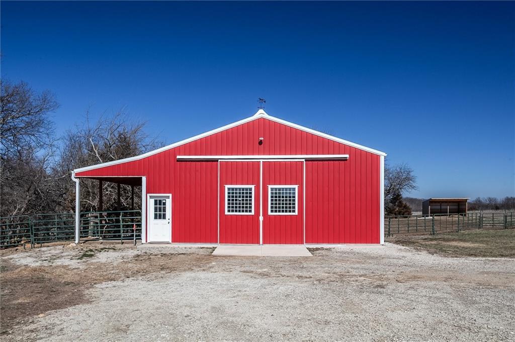 Gorgeous dream home located on 20 +/- picturesque acres. Expect to be impressed upon entering this 4 bedroom, 4 bath ranch. Open floor plan, reclaimed hardwood floors throughout main living area, vaulted ceilings, an abundance of natural light, solid wood doors and upgraded lighting. Great room featuring floor to ceiling stone fireplace, open to stunning kitchen boasting GE Cafe appliances, custom cabinetry with marble pulls and knobs, granite countertops, pot filler, gas stove and walk-in pantry. Large island and dining space to accommodate all of your family and friends making it perfect for hosting gatherings. Step outside to your private deck for enjoying the fabulous sunsets. Great master suite with vaulted ceiling, double vanity, separate shower, relaxing soaking tub and huge walk-in closet. Two additional spacious bedrooms on main level as well. Full finished walk-out lower level complete with wet bar, huge family/rec room, plenty of windows, 4th bedroom, full bathroom, safe room, plus unfinished space for storage. The property also features a 30x50 insulated shop with 200 AMP power, concrete floor, large wood burning stove, 2 separate garage doors (in/out) plus three 16x20 bays with lighting. Newly added 30x34 2 stall stable with commodity area and 30x10 lean to for additional equipment storage or animal cover. The cutest custom chicken house stays too. This remarkable property is not only beautiful, but it virtually has it all! Perfect farm space for cattle or horses, abundance of wildlife, trails through the timber down by the creek and fish in the pond. It is a sanctuary retreat by day and night all year long! Serene environment to call home! All located on hard-surface road. Easy commute to Lawrence, 15 minute commute to Baldwin City and Topeka!