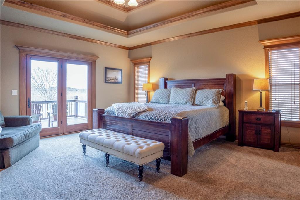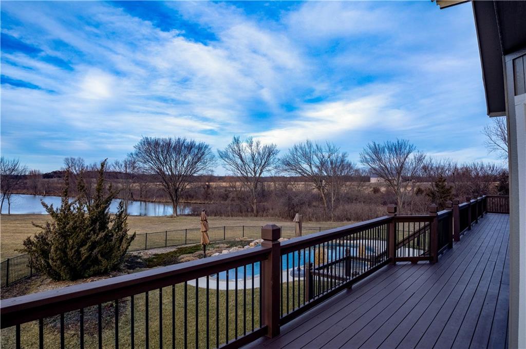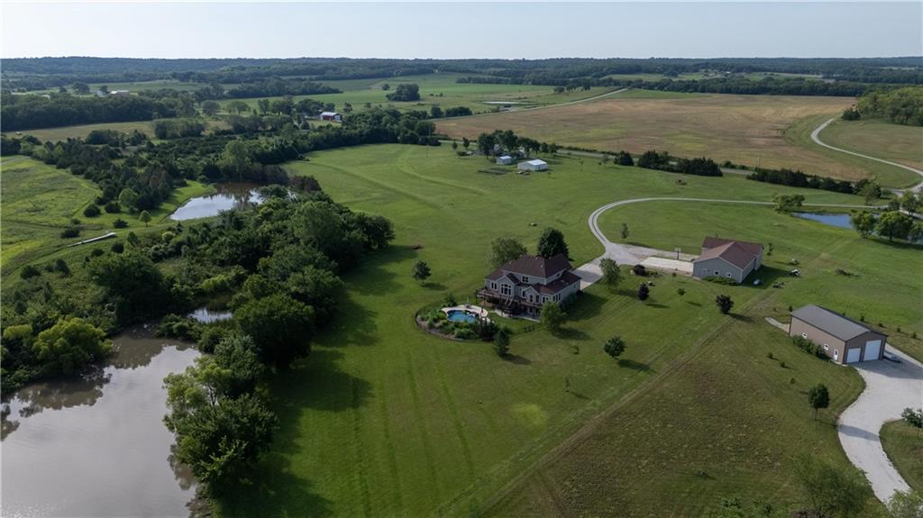 Stunning one-of-a-kind waterfront estate on approximately 10 private acres just minutes from Lawrence, Baldwin and Kansas City! Backing to the Wakarusa Watershed lake, this home offers exceptional views, privacy, and abundant wildlife on blacktop roads. The main level features an open floor plan with a deluxe kitchen, oversized island, office, and luxurious primary suite. Upstairs are four spacious bedrooms, each with bathroom access and walk-in closets. Bonus storage space in the easily accessible attic. The finished lower level is designed for entertaining with a family room, wet bar, and seamless access to the outdoor living area, custom gunite pool and spa. Offering over 5,500 sq ft of living space with 7 bedrooms and 5 bathrooms, the property also includes a four-car attached garage and an impressive 3300+ square foot heated shop with concrete floors, oversized doors, 220V electric, and RV storage. A rare opportunity for luxury lakefront living with space to work, play and unwind!