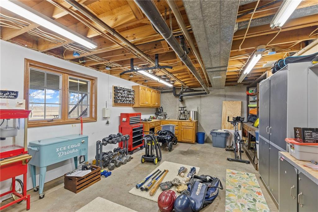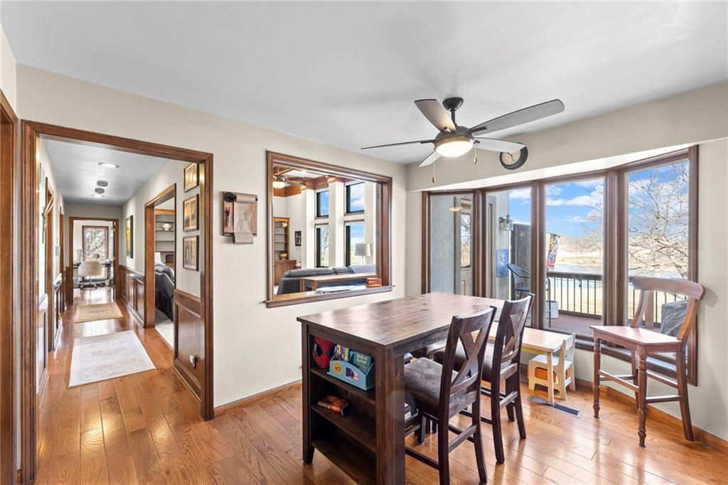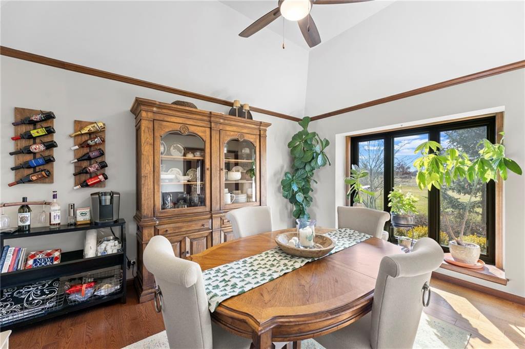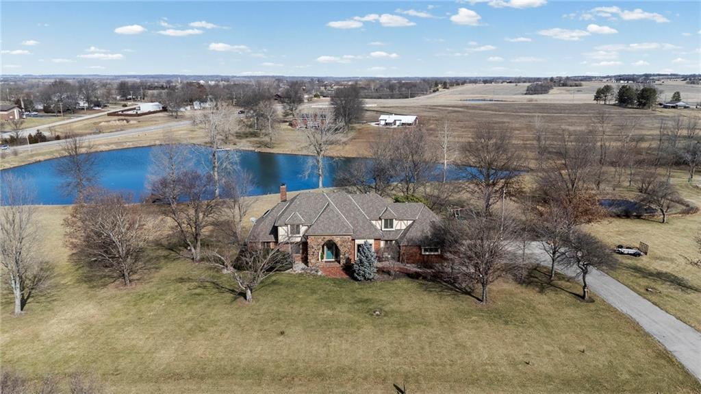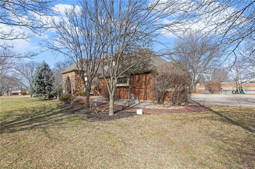 Nestled on 4.95 lush acres just north of the Paola Country Club, this exceptional custom-built 1.5-story residence offers a rare blend of superior craftsmanship and tranquil lakeside living. The heart of the home is a gourmet kitchen finished with rich walnut cabinetry, granite countertops, and warm oak hardwood floors, which flows seamlessly into a magnificent great room where walls of windows frame breathtaking views of a 2-3 acre stocked shared lake. Architectural integrity shines through the 6-inch wall construction, Anderson windows, and a high-impact resistant roof, while the interior showcases refined details like a custom-designed pecan study with solid core doors and two fireplaces. The main-floor primary suite serves as a private sanctuary with vaulted ceilings, walk-in closets, a shower and granite double vanities with Kohler fixtures. Upstairs, three additional spacious bedrooms share a beautifully updated full bathroom, ensuring comfort for family or guests. The versatile walkout lower level extends the living space with a bright family room, den, and a dedicated 24x13 workshop, all leading out to a sprawling yard, perfect for entertaining. Enjoy the fruit trees, blackberry bushes, strawberry and asparagus patches, plus a 30 ft. x 12 ft. garden area. Situated on a quiet dead-end road, this meticulously maintained brick frame and stone trim estate provides a serene escape without sacrificing proximity to local amenities.