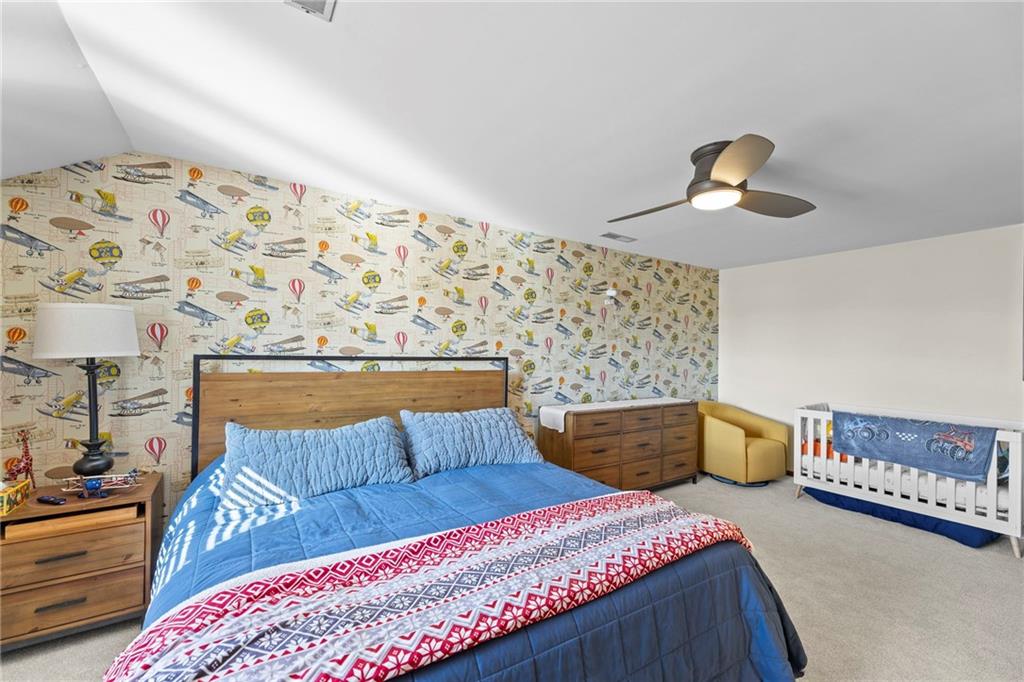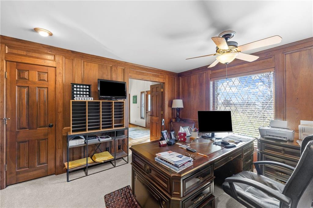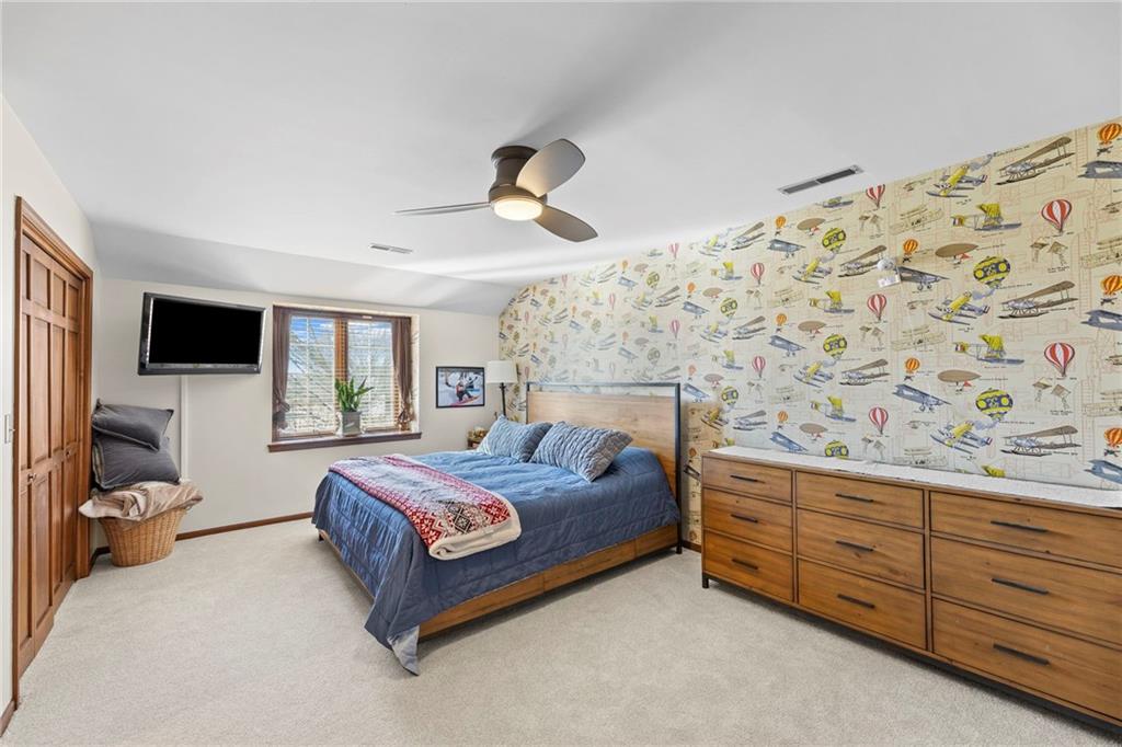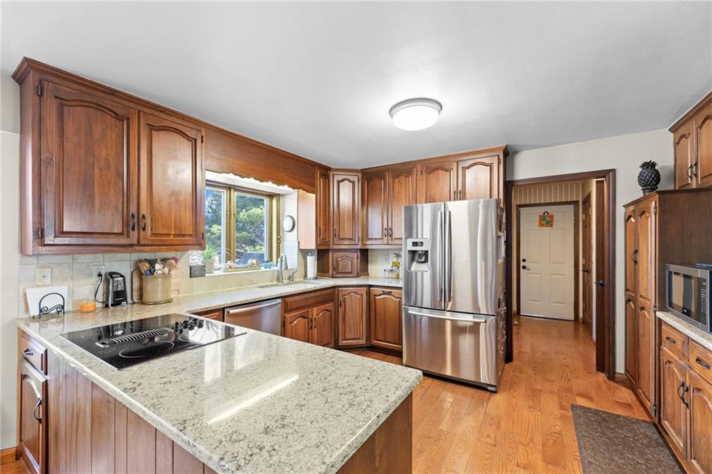 Nestled on 4.95 lush acres just north of the Paola Country Club, this exceptional custom-built 1.5-story residence offers a rare blend of superior craftsmanship and tranquil lakeside living. The heart of the home is a gourmet kitchen finished with rich walnut cabinetry, granite countertops, and warm oak hardwood floors, which flows seamlessly into a magnificent great room where walls of windows frame breathtaking views of a 2-3 acre stocked shared lake. Architectural integrity shines through the 6-inch wall construction, Anderson windows, and a high-impact resistant roof, while the interior showcases refined details like a custom-designed pecan study with solid core doors and two fireplaces. The main-floor primary suite serves as a private sanctuary with vaulted ceilings, walk-in closets, a shower and granite double vanities with Kohler fixtures. Upstairs, three additional spacious bedrooms share a beautifully updated full bathroom, ensuring comfort for family or guests. The versatile walkout lower level extends the living space with a bright family room, den, and a dedicated 24x13 workshop, all leading out to a sprawling yard, perfect for entertaining. Enjoy the fruit trees, blackberry bushes, strawberry and asparagus patches, plus a 30 ft. x 12 ft. garden area. Situated on a quiet dead-end road, this meticulously maintained brick frame and stone trim estate provides a serene escape without sacrificing proximity to local amenities.