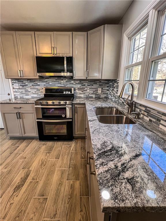 Beautifully fully remodeled home featuring 3 spacious bedrooms (all with closets) and 3 full bathrooms. The main level showcases freshly refinished hardwood floors, new windows, a stunning granite fireplace, and a modern kitchen with granite countertops and an island with sink — perfect for entertaining. The fully finished basement offers incredible additional living space, complete with a jacuzzi tub and a solid concrete cellar/shelter for added versatility and peace of mind. An attached 2-car garage and convenient highway access make this home as practical as it is beautiful. Move-in ready and a must-see!