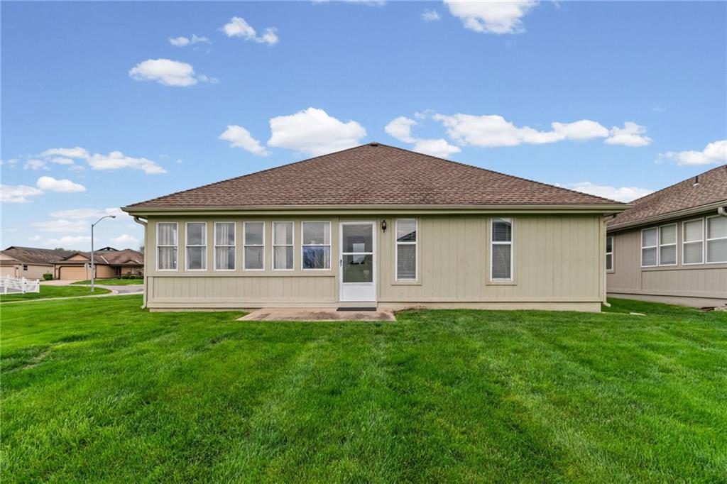 Welcome to this stunning one-level home in the desirable Morningview subdivision in Raymore! Situated on one of the largest lots in the neighborhood, this spacious corner property backs directly to the clubhouse, offering both privacy and convenience. Step inside to experience true one-level living at its finest. The home features solid wood plank flooring throughout the main living areas and ceramic tile in the kitchen and bathrooms. The kitchen is beautifully appointed with granite countertops, and all appliances stay — making this home truly move-in ready. ALL NEW INTERIOR PAINT. THE YELLOW IN PICTURES IS GONE AND A NEUTRAL COLOR HAS BEEN PAINTED. Both bedrooms offer generous space and large walk-in closets, while the two full bathrooms provide comfort and functionality. Enjoy relaxing mornings or peaceful evenings in the sunroom just off the back of the home. With its oversized lot, premium location, and thoughtful finishes, this property is a rare find in Morningview. All measurements to be verified by buying agent.