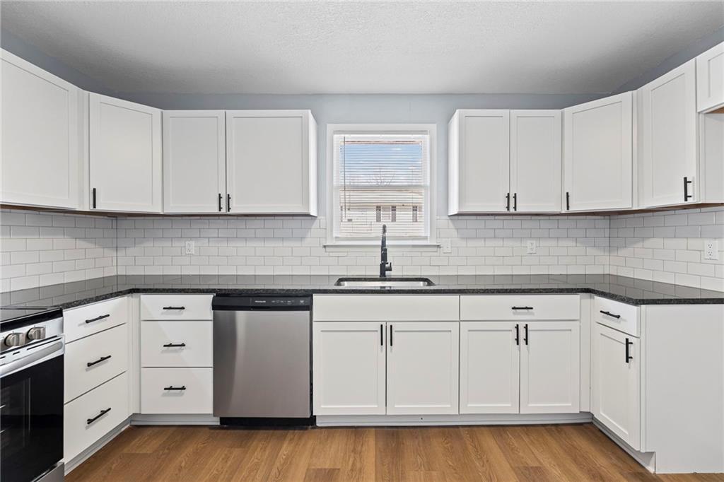 BEAUTIFULLY UPDATED RAISED RANCH! Fresh paint inside and out. Refinished wood floors in most of the home. Spacious and inviting living room. Light and bright kitchen features new crisp white cabinets, granite countertops, subway tile backsplash and stainless steel appliances! Adjacent dining area for convenience. Three bedrooms and two full updated baths! Unfinished basement for all your storage needs and garage! Nothing left to do but MOVE RIGHT IN! Quick access to major highways to enjoy all the KC area has to offer! WELCOME HOME!