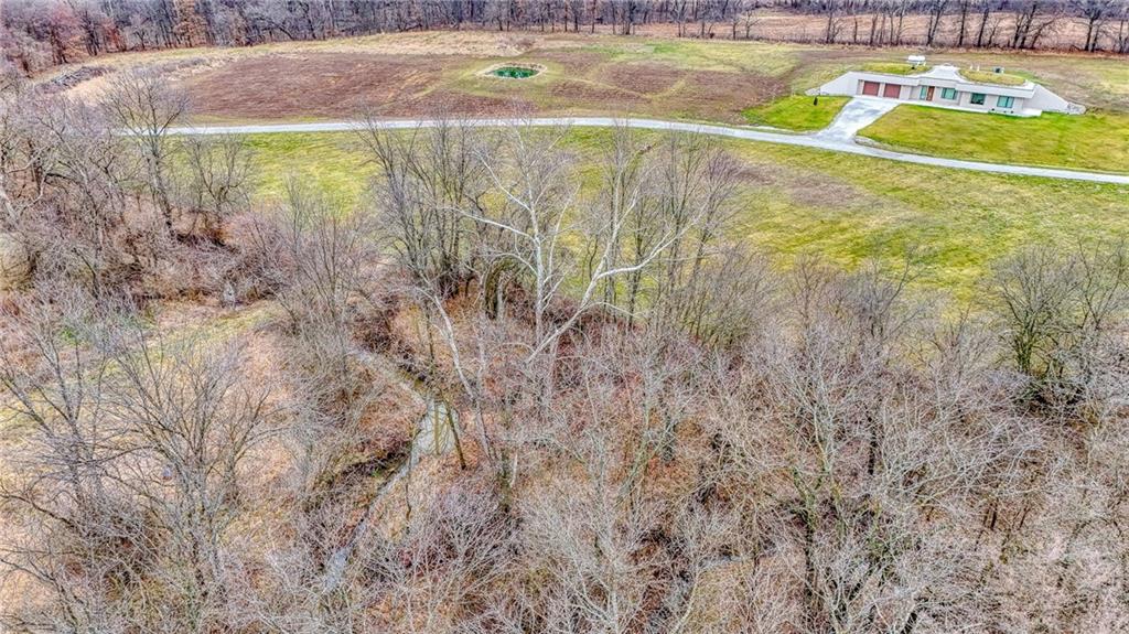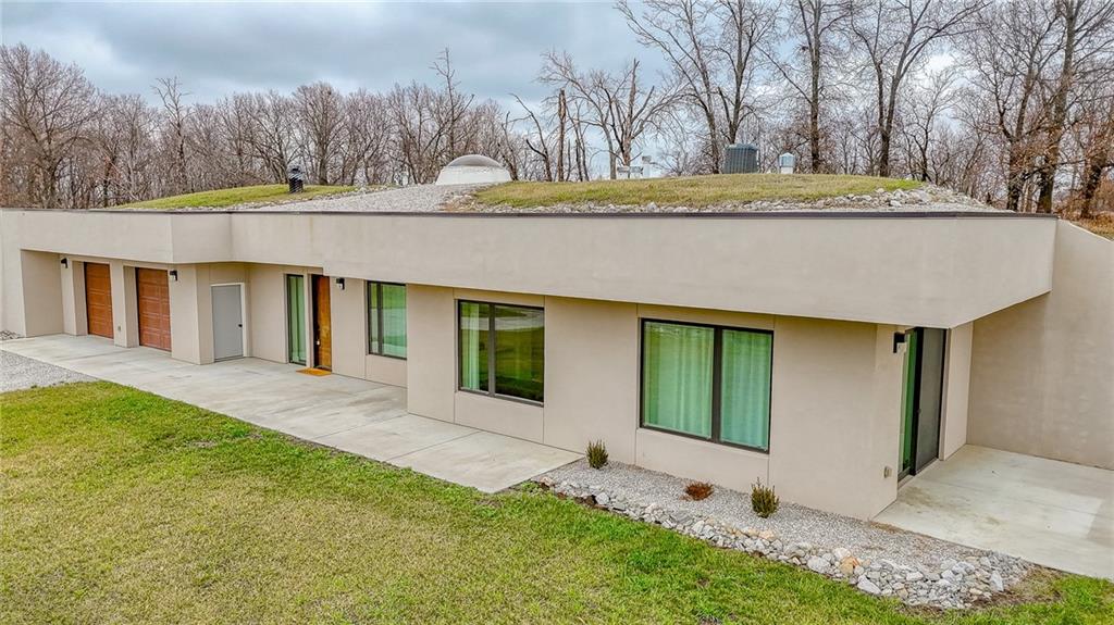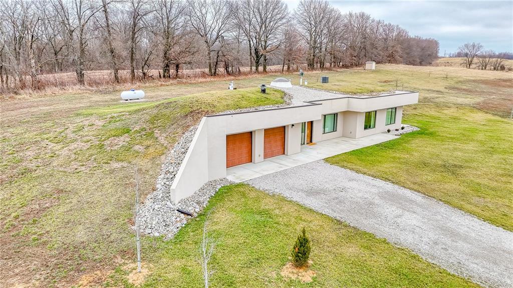 MUST SEE custom earth-contact estate on 20 scenic acres just outside Higginsville. Built in 2022, this 1,568 sq ft, 2-bedroom, 2-bath residence was thoughtfully engineered for strength, efficiency, and refined country living. Constructed with reinforced concrete walls and vaulted domed ceilings, this home offers superior durability with minimal exterior maintenance. A dramatic central skylight fills the open-concept living space with natural light, highlighting the high-end kitchen complete with Dacor luxury appliances, oversized column refrigerator/freezer, custom cabinetry with built-in organization and pull-out drawers, and a spacious walk-in pantry. Designed for year-round comfort and efficiency, the home features radiant floor heating, backup propane furnace, wood-burning stove, and a recirculating fresh air system. Average utility costs are impressively low — approximately $125/month electric (Utility Saver) and $1,000/year propane. The attached oversized 2-car garage provides generous storage and workspace. The 20 acres offer a beautiful mix of open ground and wooded privacy with abundant wildlife and endless possibilities for recreation, gardening, or simply enjoying the peaceful surroundings. This is a rare opportunity to own a nearly new, structurally superior home offering privacy, efficiency, and modern comfort — all within minutes of town.