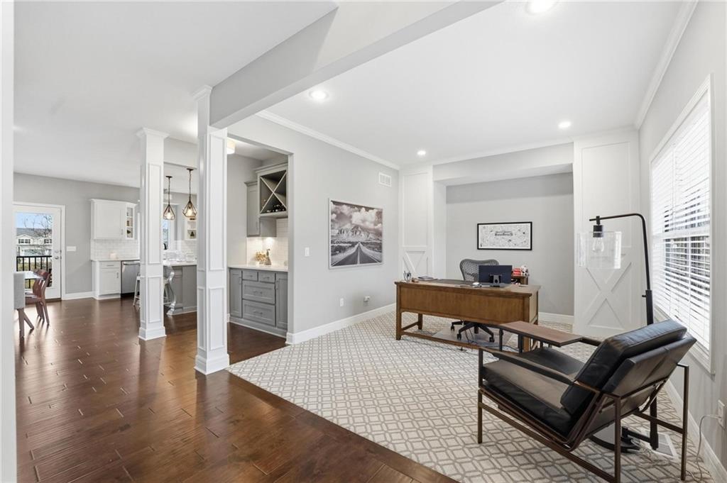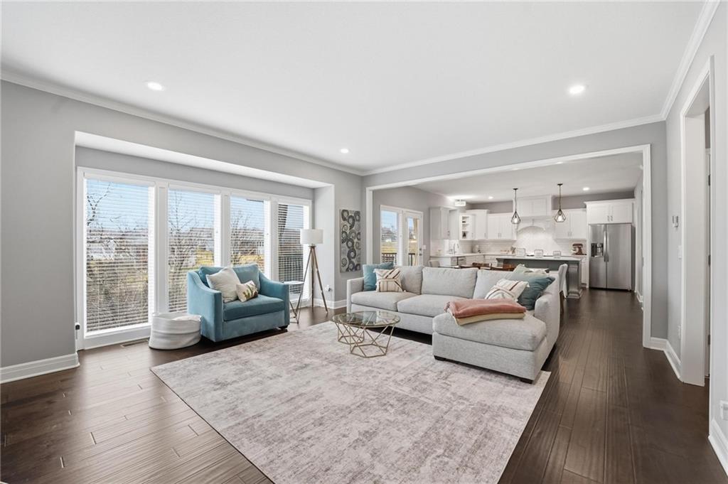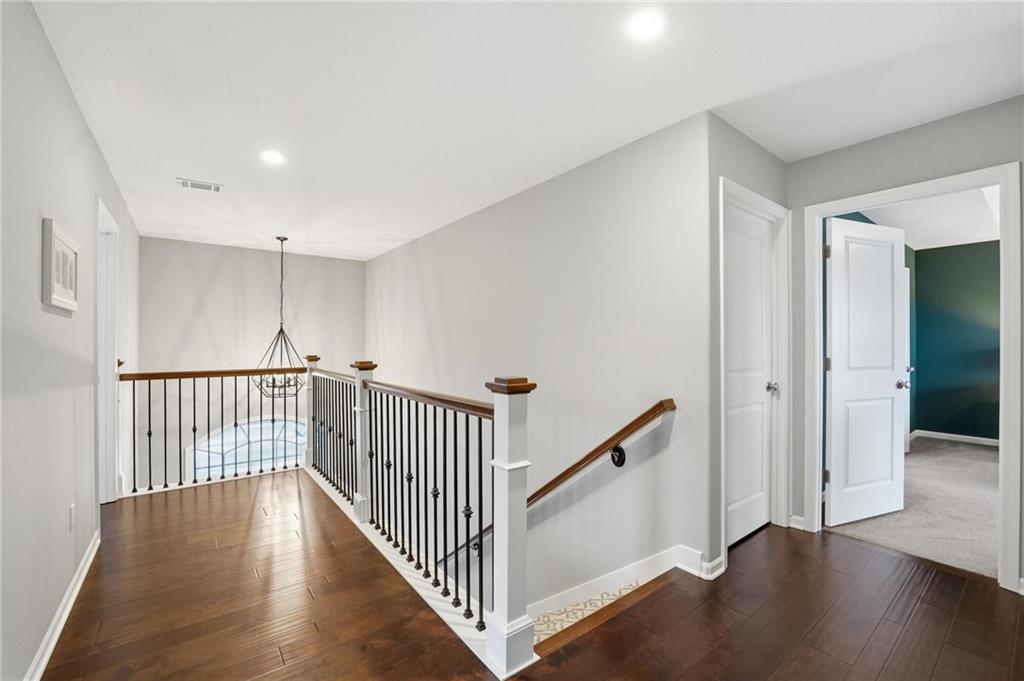 Better than new and thoughtfully designed, this beautiful 2-story home in the desirable Chapel Ridge subdivision offers space, comfort, and scenic views. From the moment you enter, you’re welcomed by a formal dining area perfect for gatherings and special occasions. Just beyond, a convenient butler’s pantry leads into the light-filled kitchen featuring quartz countertops, a large center island, pantry, and plenty of workspace. The adjoining breakfast area provides a comfortable spot for everyday dining. Step outside to enjoy the covered, screened-in Trex deck with sleek metal railings—designed for low-maintenance living—overlooking the fenced backyard and peaceful pond view. The kitchen and breakfast area open seamlessly to the inviting family room, highlighted by a stunning stone fireplace with built-in shelving and cabinetry. All four bedrooms are located on the second floor, each generously sized with ample closet space and direct access to a full bathroom. The oversized primary suite offers a relaxing retreat with double vanities, a jetted tub, dual-headed shower with bench, and a spacious walk-in closet with convenient access to the laundry room. The finished basement expands the living space with a comfortable living area, dry bar, room for game tables, a full bathroom, and a storm shelter, along with abundant storage. With beautiful finishes, functional design, and tranquil pond views, this home truly offers the best of modern living in Chapel Ridge.