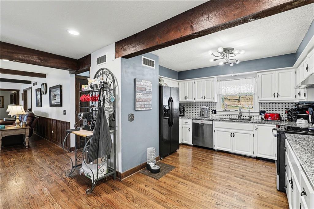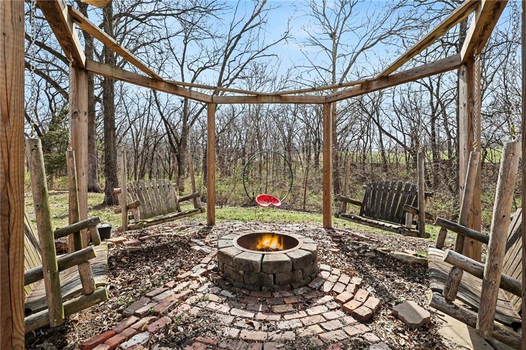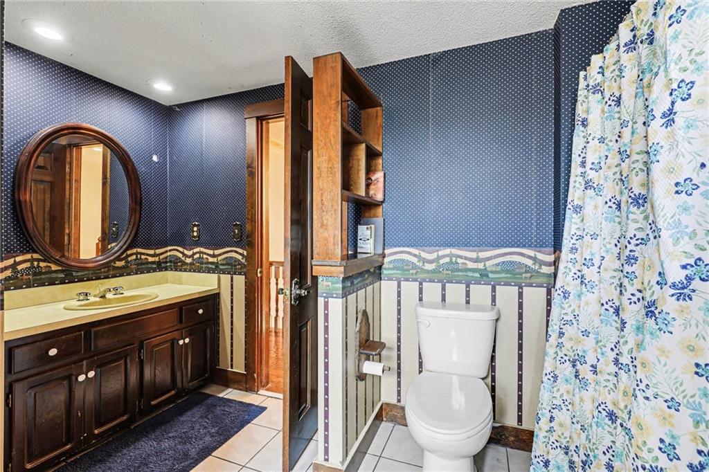 This charming, storybook home near the golf course is nestled on just over an acre with beautiful wooded views, offering character, space, and inviting farmhouse touches throughout. As you walk through the front door, you are greeted with original wood floors, open living spaces, and a gorgeous see through brick fireplace with a wood burning insert as the focal point of the living room. The dining room flows seamlessly from the living area and shares the two sided fireplace, while the spacious kitchen features granite countertops, a large pantry, and cottage inspired farmhouse charm. The primary bedroom is a true retreat with a bow window, hardwood floors, and an oversized walk in closet. The ensuite includes double sinks and a custom barn door. A second main level bedroom with its own bathroom, along with additional half baths, a laundry room, and a three car garage, complete the main floor. Upstairs offers two bedrooms and a full bathroom. The finished basement adds extra living space with a large recreation area, custom shuffleboard, a bedroom, full bathroom, generous storage, and a fourth garage, plus potential for a non conforming fifth bedroom or second kitchen. Outside, enjoy a spacious fenced backyard with a deck, covered gazebo, and patio, all backing to woods with golf course views. A charming fire pit with swings adds the perfect touch for relaxing or entertaining.