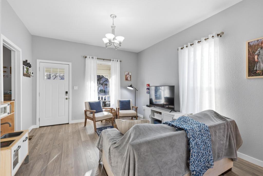 Welcome to this beautiful bungalow on Broadway! The 1200 SF home, built in 1888, underwent a complete renovation - cosmetics and mechanicals - just a few years ago. The roof. HVAC system, plumbing, electric, windows, and all aesthetic finishes are less than 3 years old, so you can rest assured that this home is ready to provide worry free comfort for years to come. It is bursting with character and curb appeal thanks to the ornate architectural detail and welcoming front porch, which appropriately set the tone for what is to come on the interior. From the moment you enter, you will notice thoughtful design and a fresh modern vibe. The neutral LVP flooring, soft gray and white interior paint, and large windows keep the space bright and airy, while brushed nickel fixtures and bold pops of blue are tastefully incorporated for a fun flare. The open concept living, dining and kitchen area flow seamlessly, showcasing consistent design choices throughout, and highlighting the kitchen's quartz countertops, custom two-toned cabinetry, and classy glass tile backsplash. The layout offers practical and efficient one-level living with the primary bedroom and en-suite bathroom situated right off the kitchen, and two additional bedrooms plus a second full bathroom located off the living room. The laundry/mudroom is conveniently found right inside the back door which leads to the rear deck and fenced in yard. A nice metal carport, complete with a built-in storage area, rounds out the offerings in the back. There's no to-do list on this move-in ready gem - all of the projects have already been completed for you! Don't miss out on the opportunity to own this adorable, updated bungalow, where classic style meets modern convenience.
