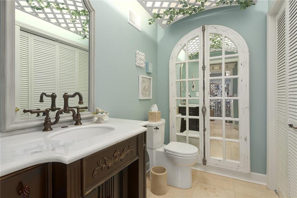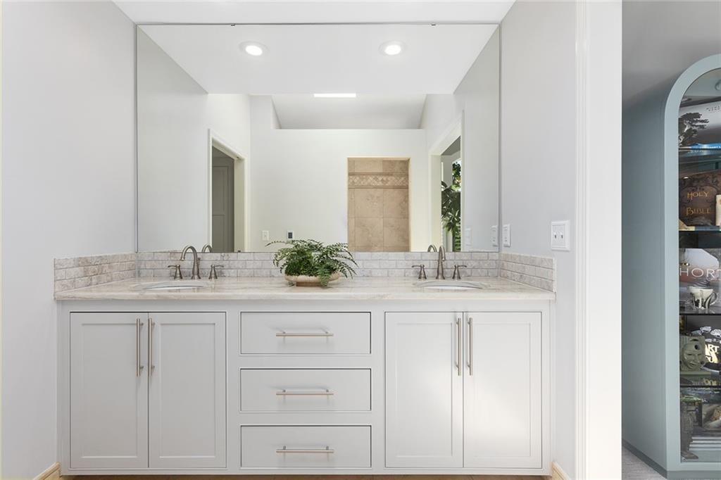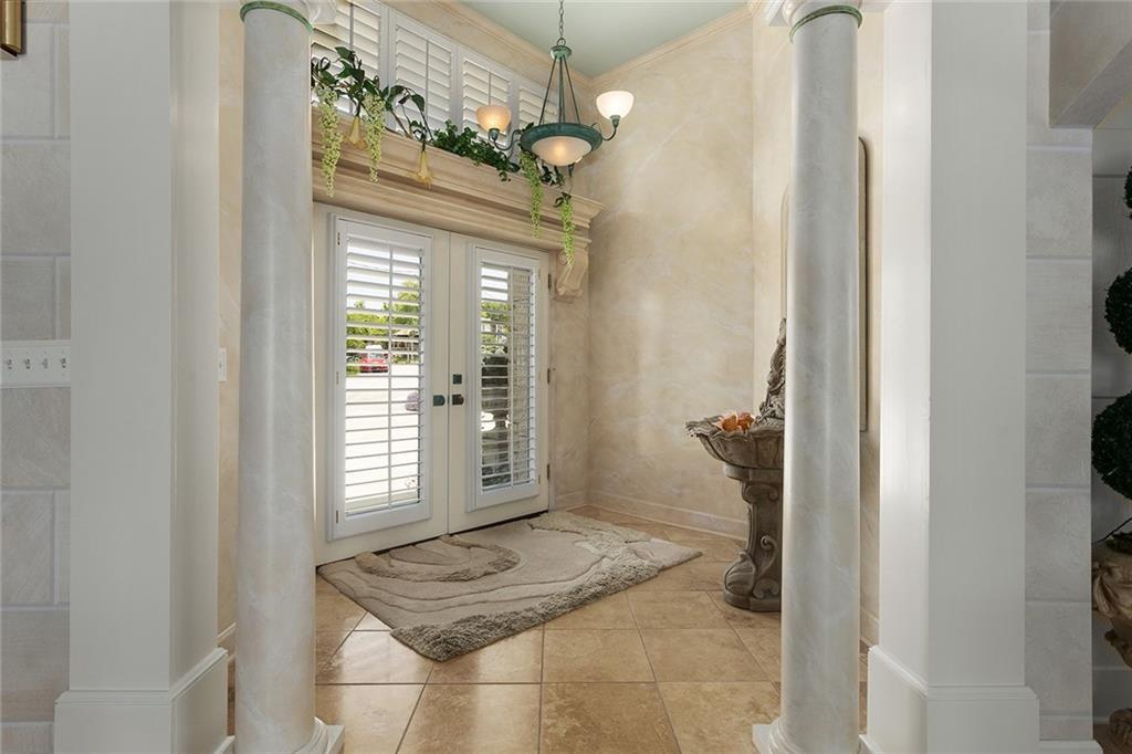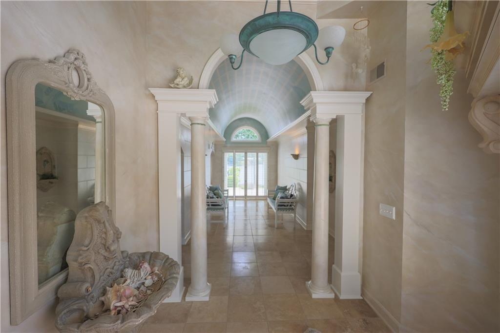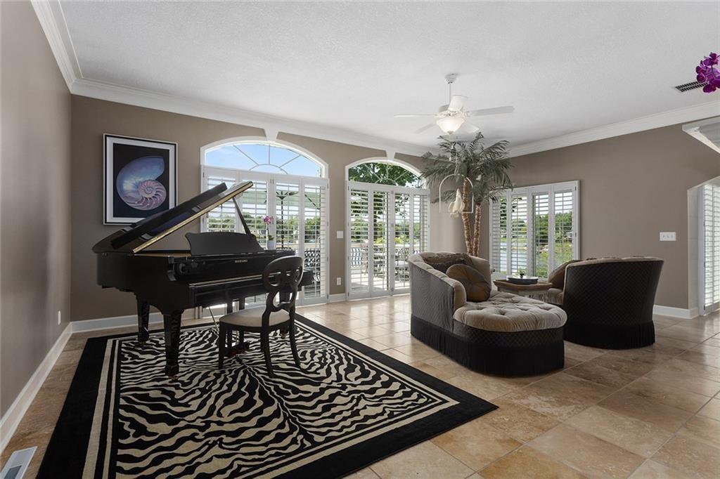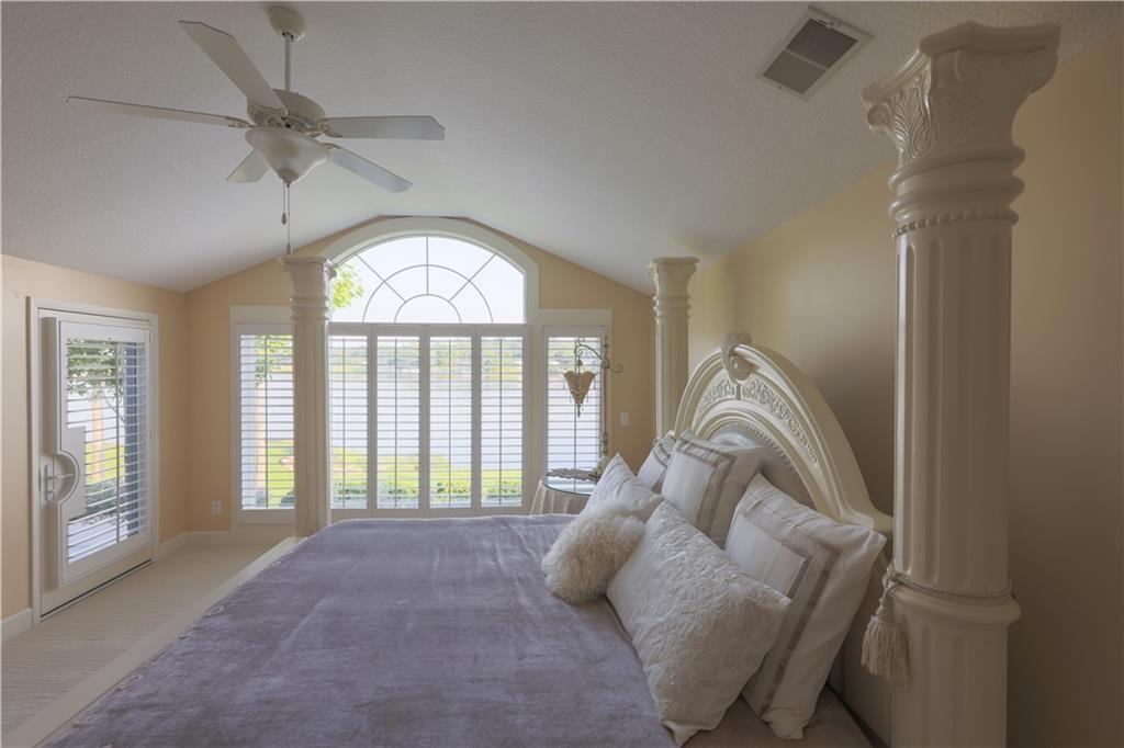 Tucked away on one of the most coveted lakefront lots in the Northland, this one-of-a-kind, custom-built home was thoughtfully designed by an interior designer to take full advantage of its breathtaking views. Nearly every room in this meticulously maintained residence has water views. Step into the grand foyer where soaring columns and faux marble accents set an elegant tone. From there, a second entry welcomes you with a barrel-vaulted, hand-painted ceiling and sweeping lake views that draw you further into the heart of the home. The French country-inspired kitchen is a dream for any entertainer or home chef, featuring a hand-selected marble island, custom cabinetry, a cozy stone fireplace, built-in entertainment center and desk, and an all-glass breakfast room with arched windows overlooking the lush, landscaped yard with multiple water features. The hearth room flows into a spacious living room with a see-through fireplace, a wall of glass framed with plantation shutters. The primary suite is a peaceful retreat with patio access, high ceilings, custom built-ins, upgraded carpet, and plantation shutters. The ensuite bath offers a spa-like experience with a dome ceiling over the soaking tub, walk-in shower, and dual vanities. A second bedroom also has direct patio access and features elegant travertine floors. Recently added second living quarters include a full gourmet kitchen, living area with built-ins, breakfast nook, second master suite with luxurious bath, large walk-in closet, and even a second laundry room—perfect for guests, in-laws, an adult child, or anyone looking for privacy and independence. The space also features its own private entrance. Additional highlights include a spacious three-car garage with high-end epoxy floors, a private dock with a pontoon boat included, full irrigation system, expansive patio and deck spanning the length of the home, and professional landscaping throughout. This is more than just a home—it's a lifestyle.