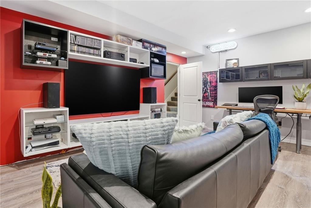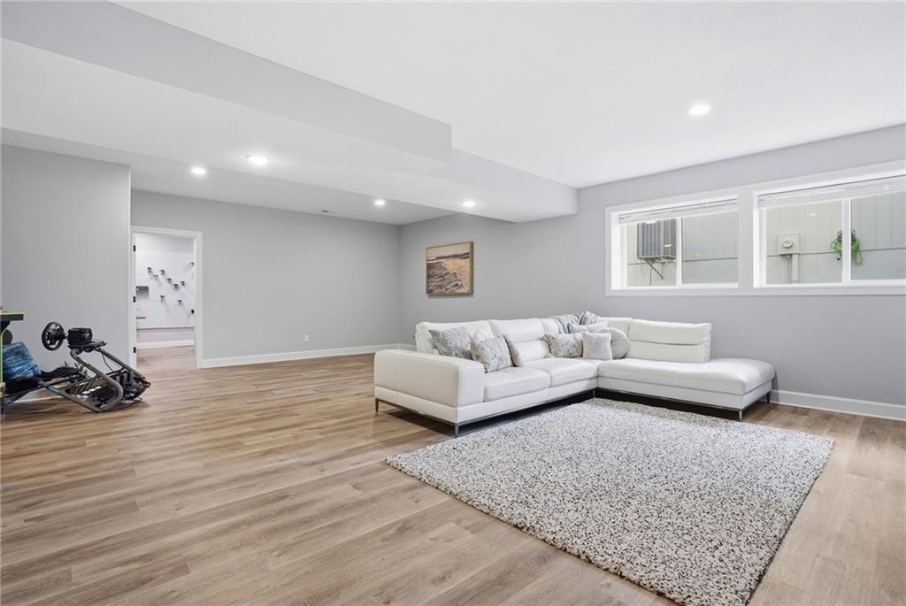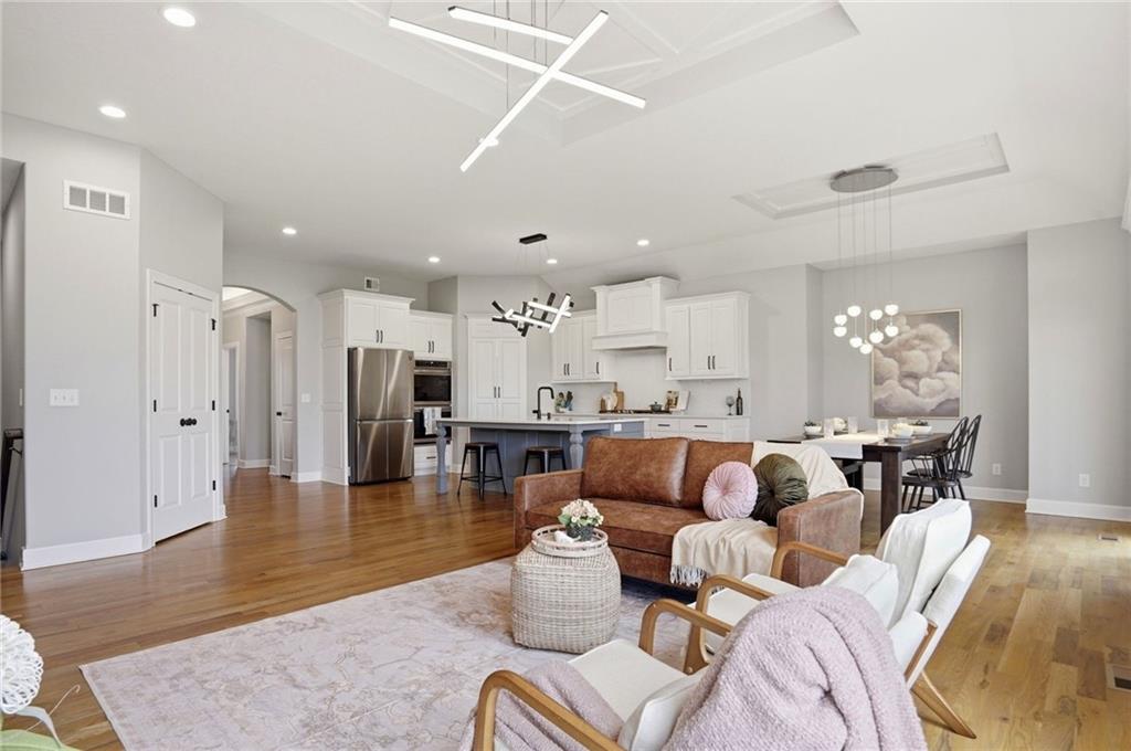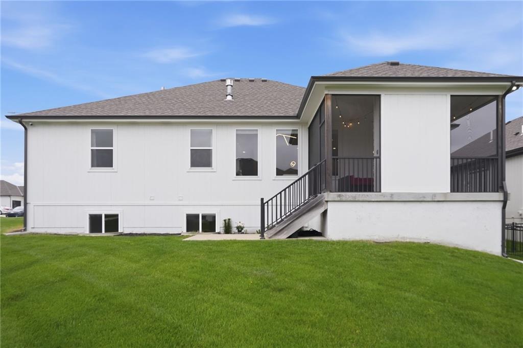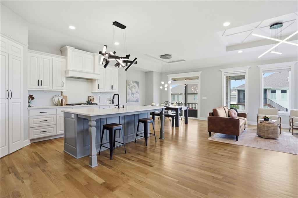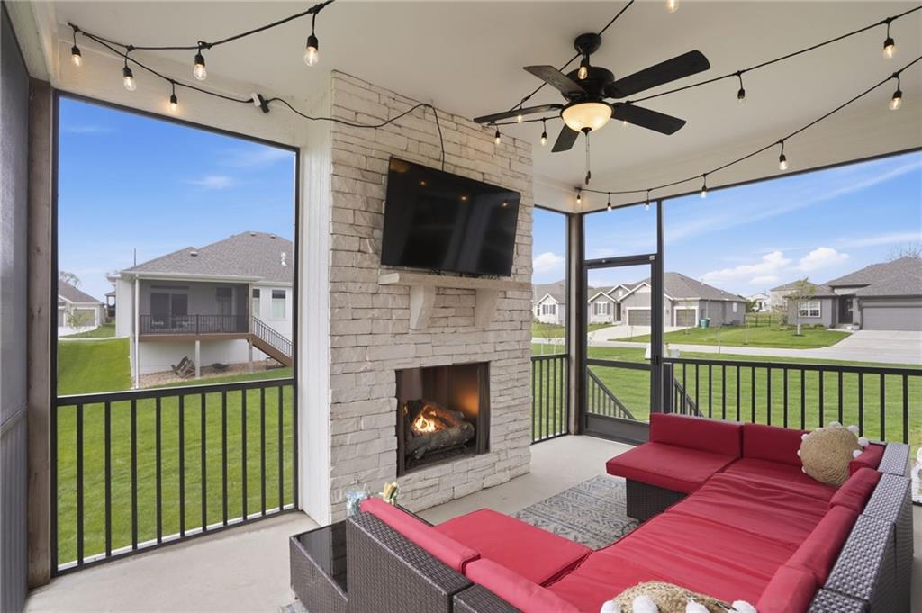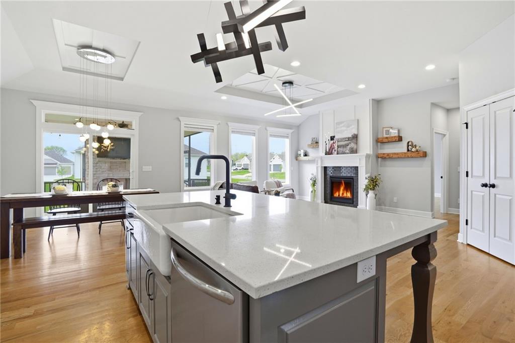 Welcome to your next neighborhood! Brookwood Farms is a vibrant, warm, welcoming, and social community with a pool, playground, fishing pond, and walking trails. Welcome to your next home! The home features Main-level Living, Hardwoods, Quartz Countertops Throughout, Upgraded Light Fixures, Ethernet in All Rooms, Hardwired Camera System, Covered-Screened-In Patio with Gas Fireplace, 220v Outlet for EV Charging Station, Built-In Ceiling Speakers in the FOUR-CAR Garage! This home is ideal for the remote worker, tech enthusiast, car collector, hobbyist, growing household, sports &/or outdoor enthusiast, or boat owner (Hillsdale Lake is just 16 minutes!). Inside this reverse 1.5 story home, find a spacious open floor plan designed for comfortable living and entertaining along with 4 bedrooms and 3 full bathrooms; providing plenty of room for you, your family and/or guests. Every detail considered! This home stands out from others with it's first impression curb appeal of the white & black modern farm-house style, to 4 frosted glass panel garage doors, to interior upgraded features that you will love - dramatic barrel-vault entry hall, arched openings, stainless steel double ovens and gas range, farmhouse style sink in large kitchen island, granite counter tops, shiplap feature wall framing the living room fireplace, boxed ceiling in primary bedroom, free-standing soaker tub in ensuite, walk-in shower, modern light fixtures, and soft backlighting throughout. Step outside to take-in sunrise over the neighborhood pond or the sunset as the day winds down, all from the screened-in covered deck with stone fireplace which creates a cozy outdoor living space you can use year-round. A rare combination of functional living space and an exceptional garage/workshop setup that’s increasingly hard to find. This home truly has it all in the fastest growing residential community of Spring Hill, Kansas!