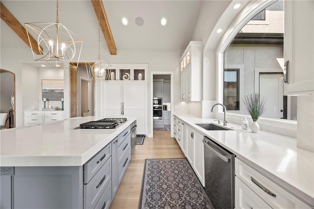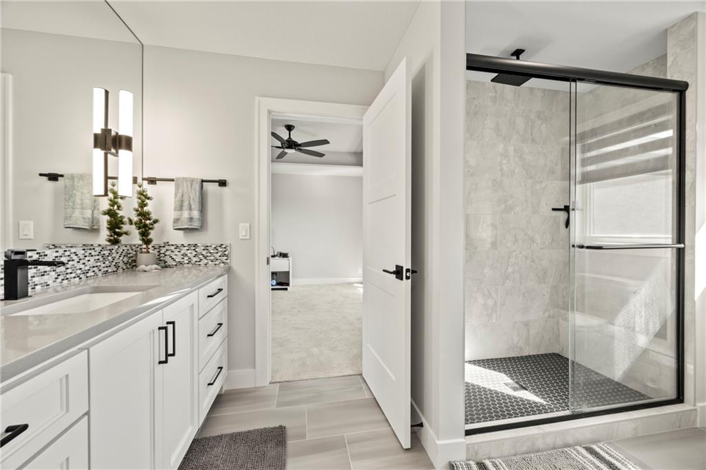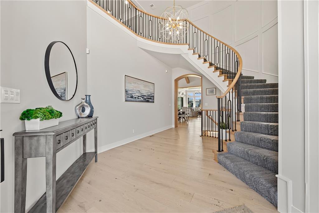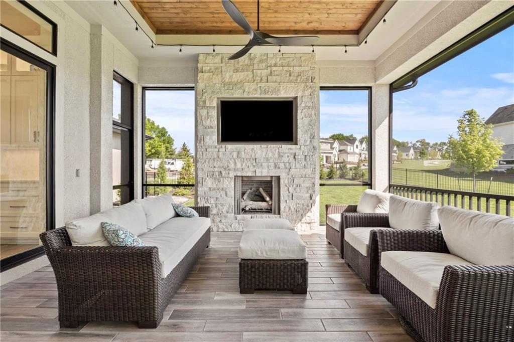 Amazing one and a half story home with a full finished walkout basement in Mills Ranch ready for quick move-in. This nearly new, 3 year old Willis Custom Built home is a stunner with a spacious vaulted main floor living space, impressive curved staircase, arched doorway to the great room, unique 2nd bar, theater room, screened in lanai sun porch, walk in double shower with freestanding tub, huge 4 car split garage with high lift doors, dog wash, pocket office, premium sound system and smart tech package. So many unexpected extras in this home around every corner. This 1.5 Story floor plan features a main floor primary suite with luxurious spa bath with with white quartz and mini tiles. Must see! Upper level offers private spaces with loft, second laundry and two premium bedrooms loaded with extra features and upgraded baths. You'll love the fully finished walkout lower level with LVT flooring, movie room, wet bar and 4th bedroom. This upscale home sits on a corner lot with a side entry four car garage and a front circle drive. Beautiful landscaped and fully fenced unique backyard allows for you to access from the main level and walkout on the side. Move right in to this amazing home located in Mills Ranch with a new neighborhood pool, and easy access to the Johnson County walking trails and quick access to Highway 69. All the luxuries of a new home are already added including premium window coverings, fenced yard, water bottle filler, built in side-by-side refrigerator and premium sound system. Why build when you can move right into this award-winning Willis Custom Home. Blue Valley School District