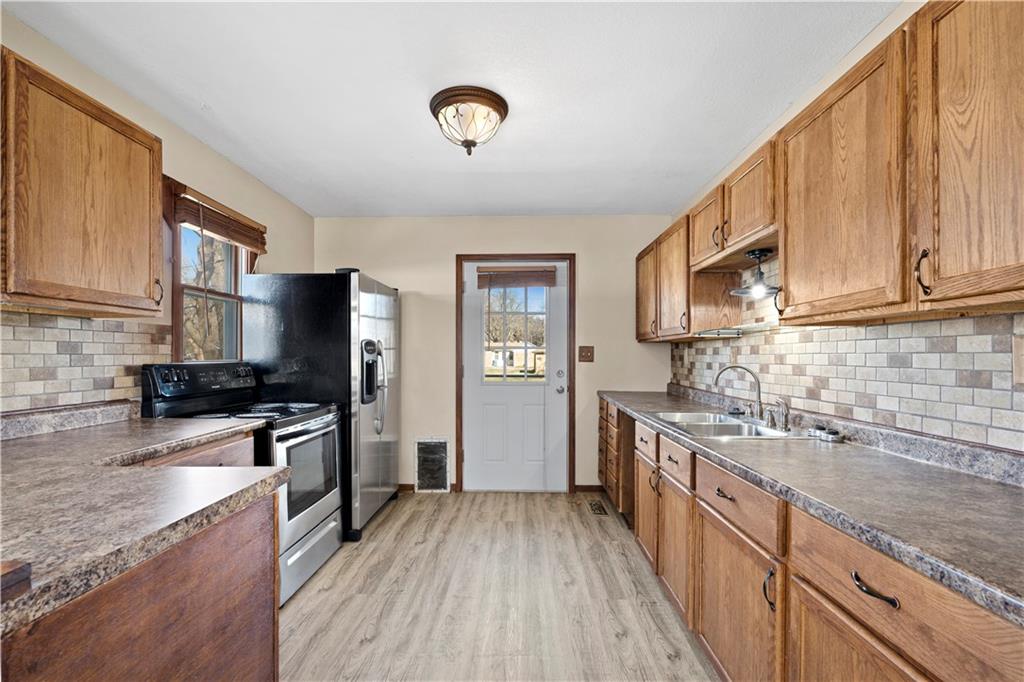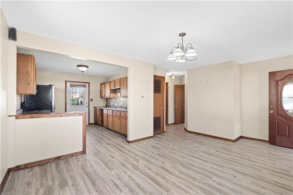 This well maintained 2 bedroom, 1 bathroom home, built in 1995, offers comfortable living with thoughtful updates throughout. Inside, you’ll find new luxury vinyl plank flooring and fresh interior paint that give the home a clean, updated feel, while wood trim throughout adds warmth and character to the living spaces. A durable metal roof provides long term value and low maintenance. The kitchen offers generous cabinet and countertop space, a tile backsplash, and includes the refrigerator and range with the sale. The layout flows easily into the living and dining areas, creating a functional space with plenty of natural light. The bathroom features tiled walls with decorative accents, a large vanity, and a tub and shower combination. Step outside and enjoy the screened in front porch, a great spot to relax and unwind. The fenced yard provides space for pets, gardening, or outdoor activities. Additional features include a detached garage, covered carport area, and convenient rear alley access for additional parking and easy entry to the property. The manageable size and practical layout make this property well suited for a variety of living needs. With recent interior updates and durable exterior features, this home offers a move in ready opportunity in Rich Hill, Missouri.