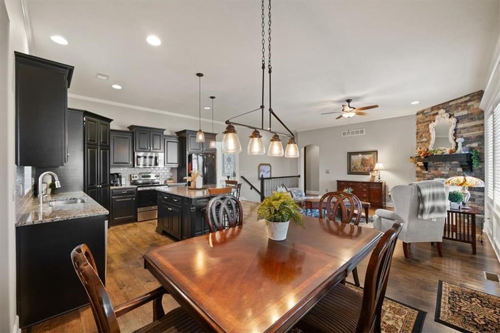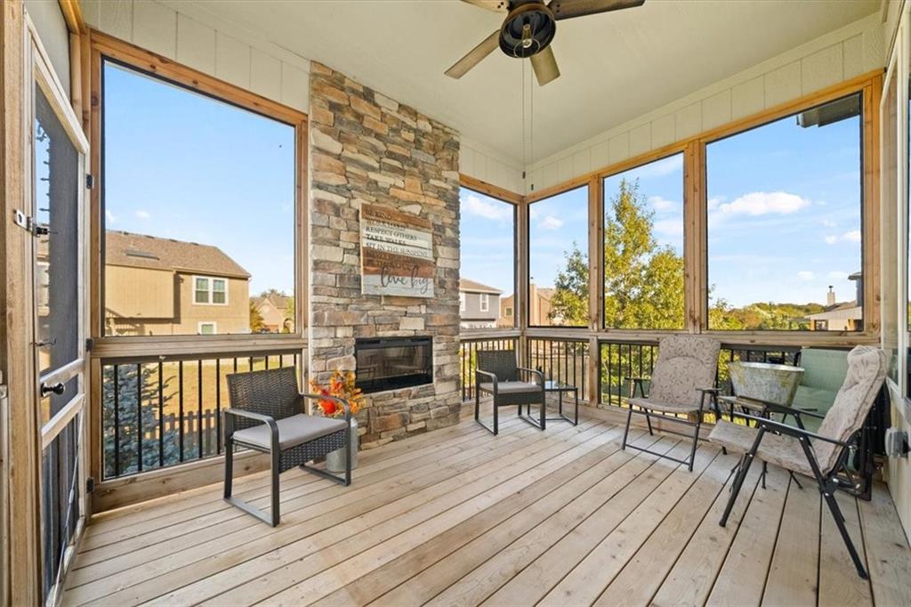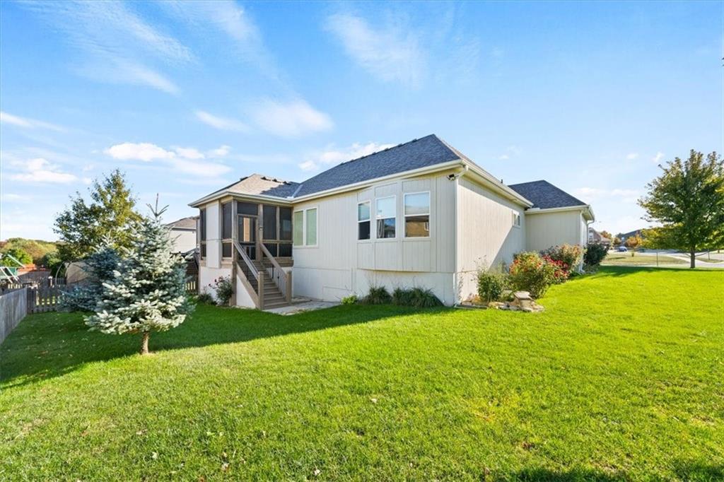 Meticulously maintained reverse 1.5-story home on a daylight lot featuring 4 bedrooms (2 on the main level), 3 full bathrooms, and a 3-car garage. The primary suite offers a luxurious ensuite bath with tile finishes, double vanity, walk-in closet, Euro shower, and a relaxing soaker tub. The laundry room is conveniently located just off the primary closet. The main level features gorgeous hardwood floors, plantation shutters, and a stunning stone fireplace. In the kitchen you will see granite countertops, a walk-in pantry, and stainless-steel appliances, making the it both beautiful and functional. The finished lower level includes two additional bedrooms and a spacious family room, perfect for guests, entertaining, or additional living space. Enjoy outdoor living with a screened-in covered deck featuring a fabulous outdoor fireplace—ideal for relaxing or entertaining year-round.