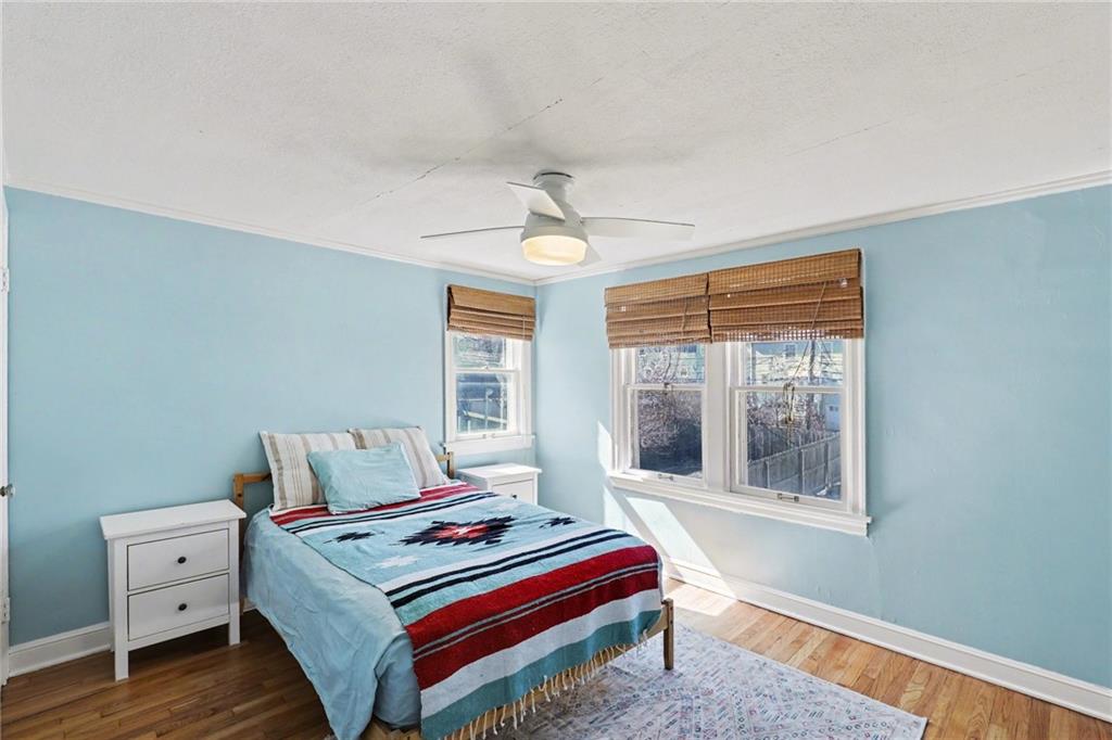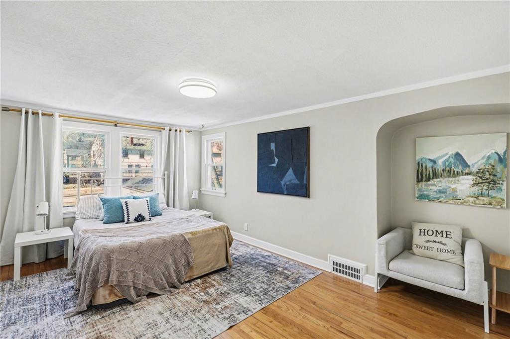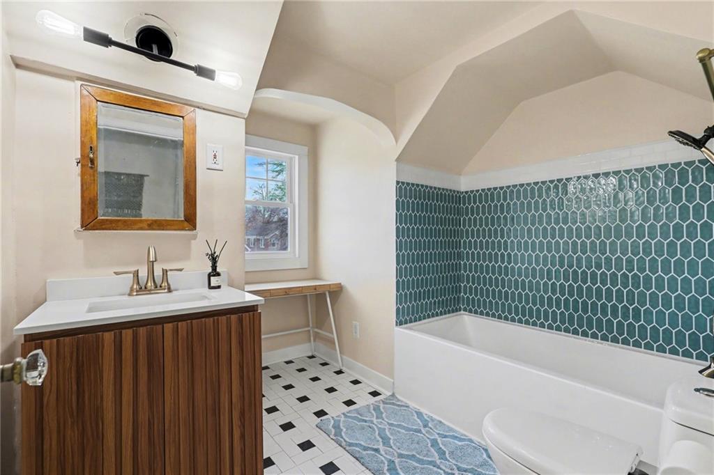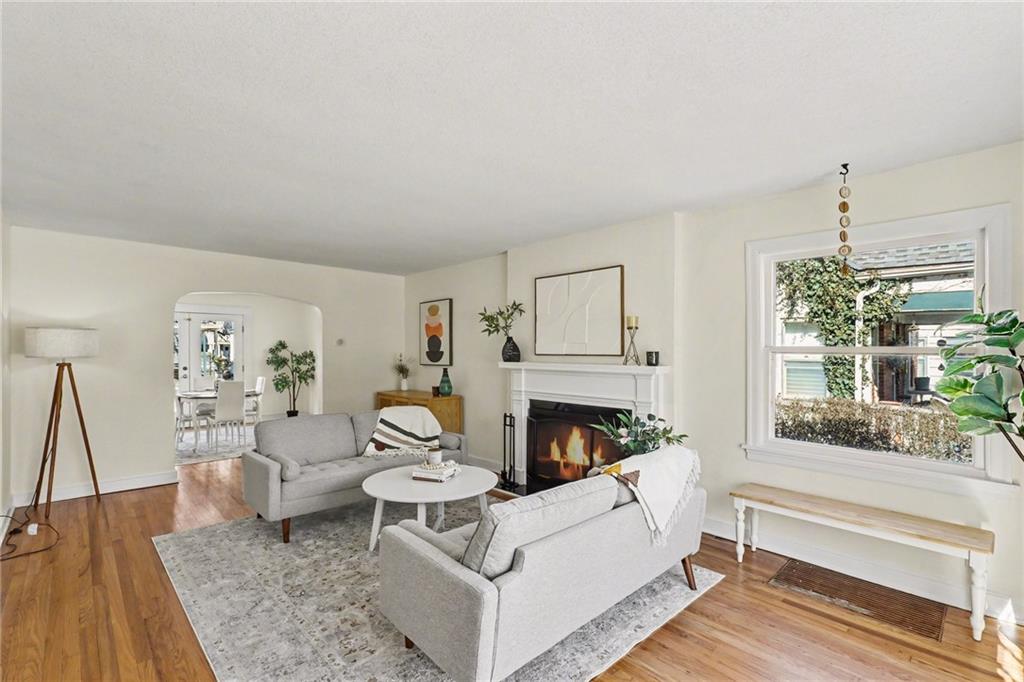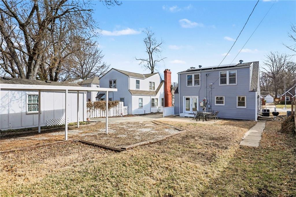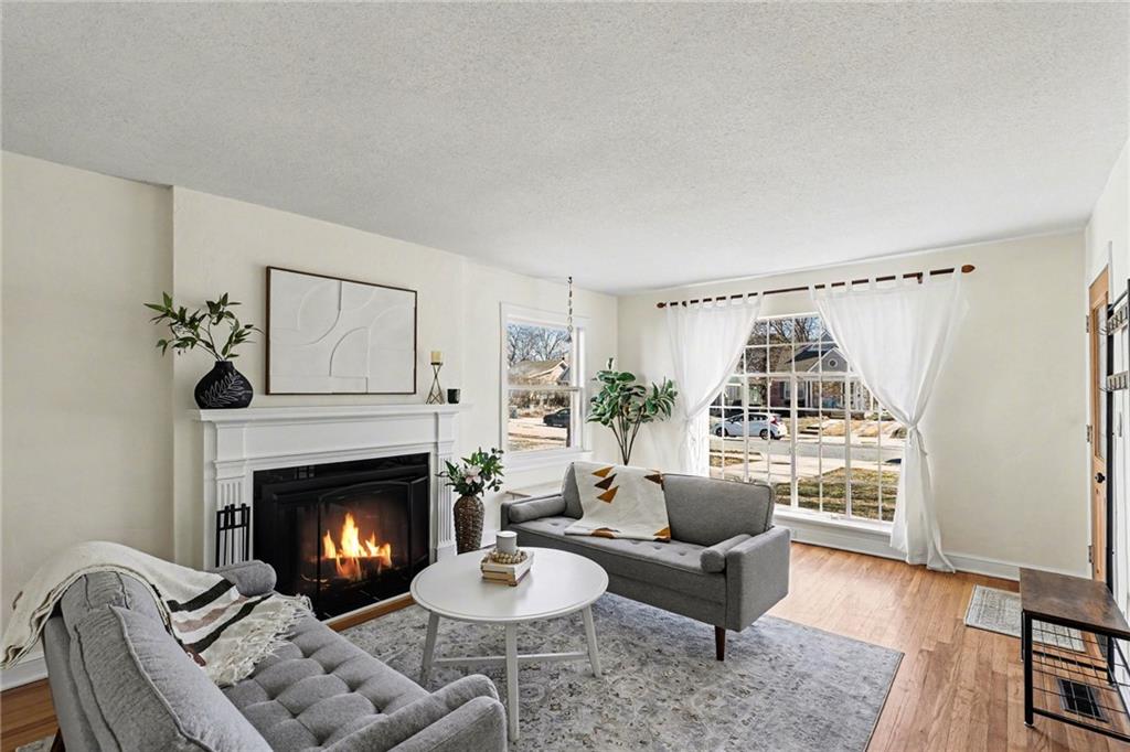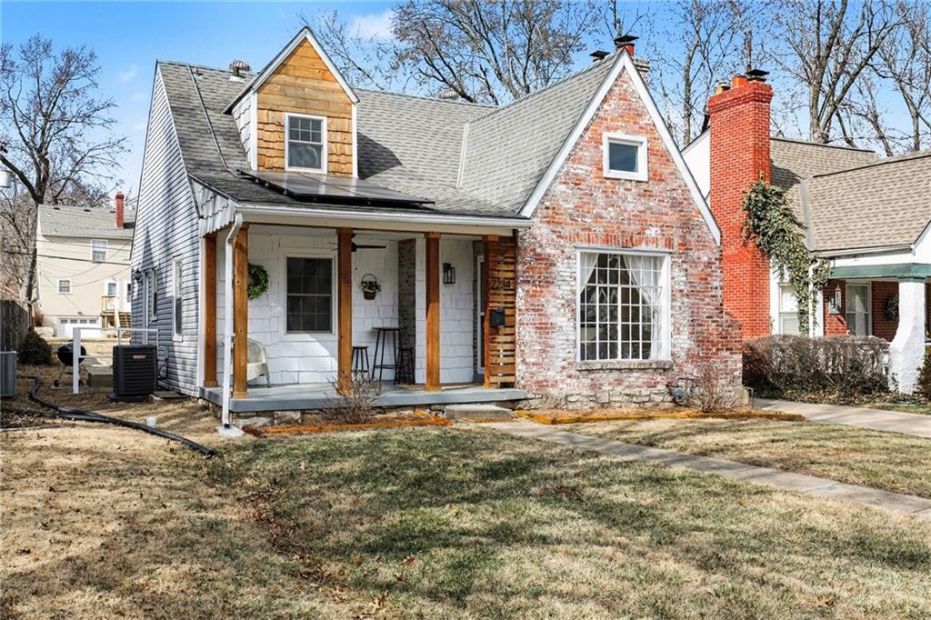 7234 Baltimore St • 1.5-Story Tudor/Traditional • Solar panels • 3BR/2BA • 1,659 SF • Classic 1937 charm meets clean updates in this brick-and-trim Tudor with a covered front porch and dormer details. Inside, the living room features hardwood floors, a large picture window for natural light, and a masonry fireplace. The kitchen offers ample cabinetry, white counters, tile backsplash, dishwasher, and a gas range, with room for a breakfast nook. Two refreshed bathrooms showcase modern fixtures and standout tilework. Main-floor bedroom plus additional bedrooms upstairs; huge walk in closet! Full stone/rock basement provides storage and utility space. Brand New HVAC. Outdoor living includes a patio/deck, and parking is served by a shared driveway with carport-style covered parking. Solar panels are already installed to help offset electric costs. Convenient access to Ward Parkway and W Gregory Blvd.