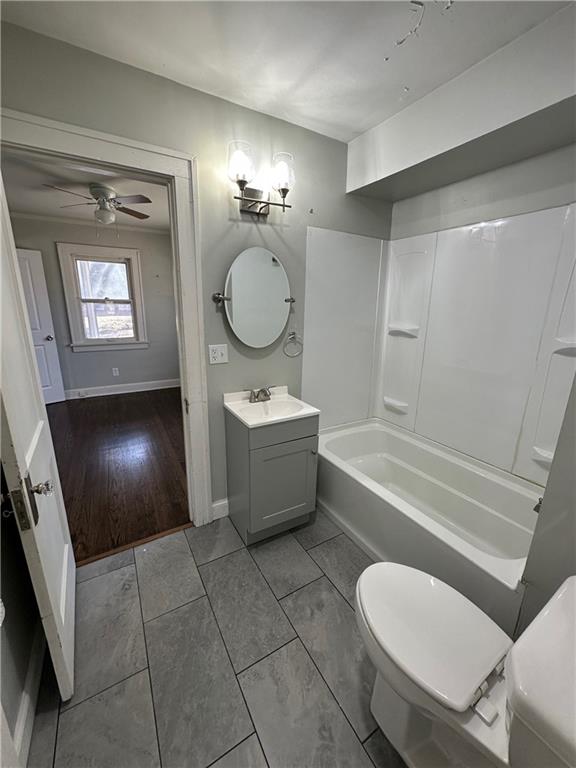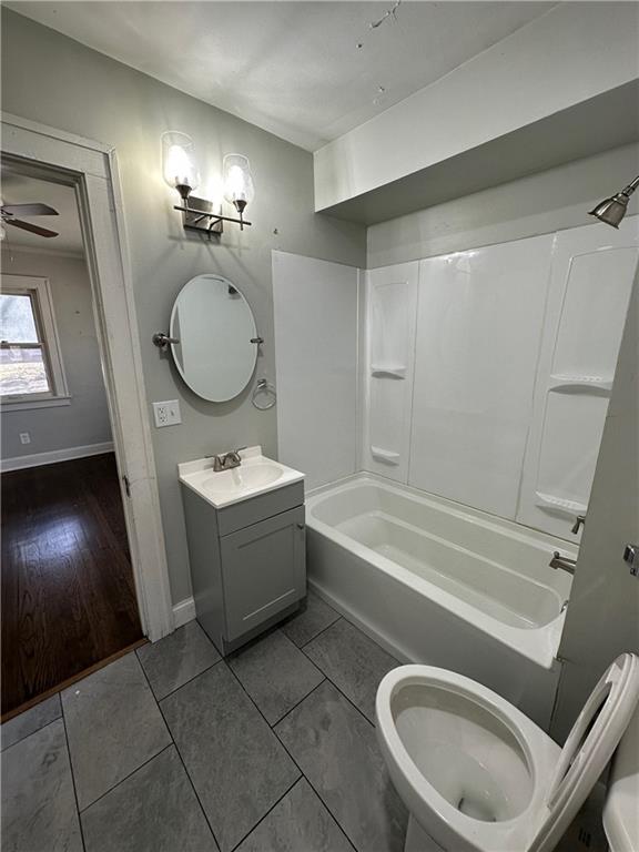 Full bath featuring vanity, shower / bath combination, ceiling fan, and light tile patterned flooring