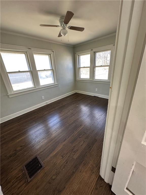 Empty room with dark wood-type flooring, ceiling fan, and crown molding