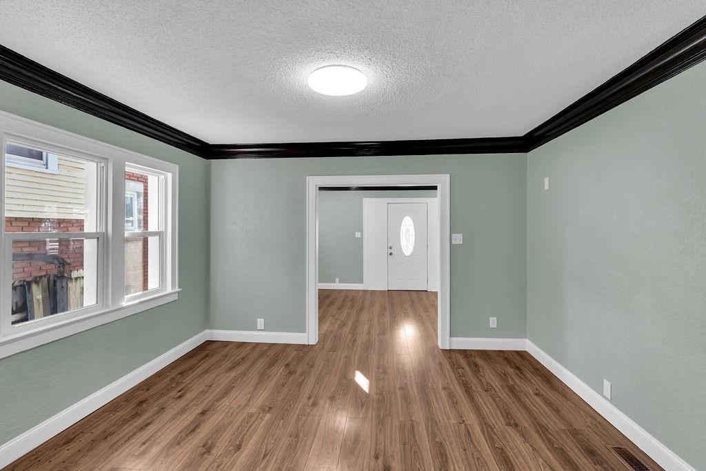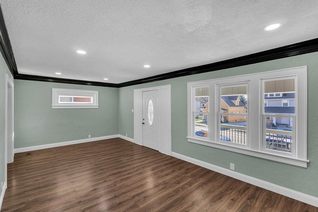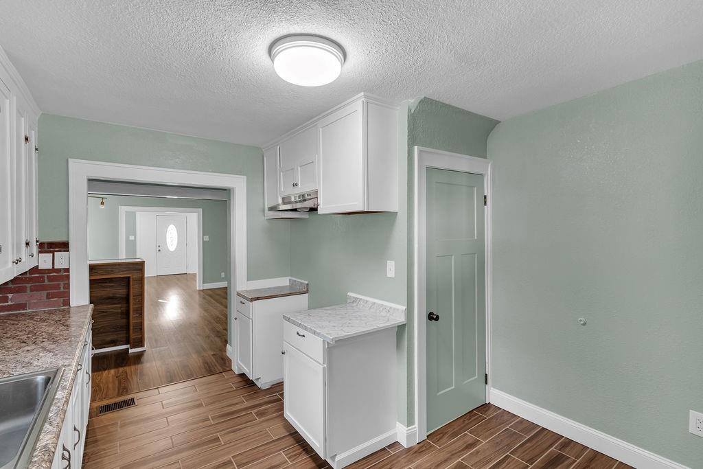 Fully renovated craftsman bungalow with charming curb appeal and thoughtful updates throughout! The covered front porch, gray lap siding, brick columns, and stone foundation give this home a classic look with fresh finishes. Step inside to find LVP flooring, dark crown molding, and recessed lighting throughout the main living areas. The living room features a brick fireplace flanked by built-in bookshelves. The updated kitchen offers white cabinetry, stone-look countertops, an exposed brick backsplash, and a breakfast bar that opens to the dining area. The bathroom has been refreshed with a tub/shower combo, glass slider door, and black hardware accents. The unfinished basement provides excellent storage or future finishing potential, with new plumbing already in place. Don't miss this move-in ready home with character and updates you won't find at this price point!