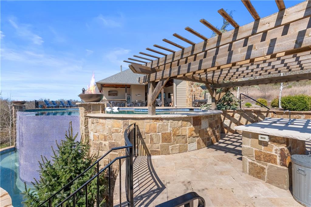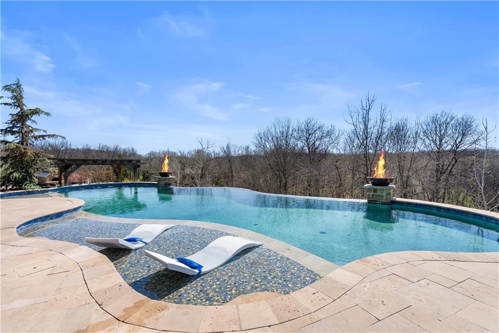 Dreams truly come alive in this one-of-a-kind custom Reverse 1.5 Story estate nestled on 9+ breathtaking acres in unincorporated Jackson County within the Lee’s Summit School District. This private retreat offers unmatched craftsmanship, panoramic treetop views & resort-level amenities that cannot be replicated. A grand front porch w/stone accents & custom doors welcomes you into a stunning interior featuring soaring 12-foot ceilings on both levels & architectural detail throughout. The main level showcases a dramatic living area w/west-facing views and a chef’s kitchen designed for everyday luxury and entertaining—complete with oversized island, custom shelving, walk-in pantry, double refrigerator/freezer combo, & oversized gas range. Light filled dining space, coffee bar-perfect for morning routines. The primary suite is a private sanctuary w/direct access to the covered patio for seamless indoor/outdoor living. The spa inspired bath features dual vanities,deep soaker tub, walk-in shower, & a generous walk-in closet w/custom built-ins. A main-level den (or 2nd bdrm) & convenient laundry complete the layout. The finished lower level is an entertainer’s dream featuring an oversized golf simulator & projector ,full wet bar, media/rec space, pool table area, exercise room w/sauna, & 2 additional bedroom suites each w/private baths & walk-in closets. A suspended garage provides rare lower-level 4th garage access—ideal for workshop, car collection, or storage. And then…This resort-caliber setting rivals luxury destinations. The vaulted covered patio w/stone FP creates year-round ambiance. Step outside to a spectacular infinity-edge pool with swim-up bar, tanning ledge, outdoor kitchen, & unobstructed treetop views offering 100% privacy. Entertain in your custom silo bar, practice on the putting green, unwind beside three cascading rock waterfalls surrounded by professional landscaping & custom exterior lighting. A signature property offering an unmatched lifestyle.