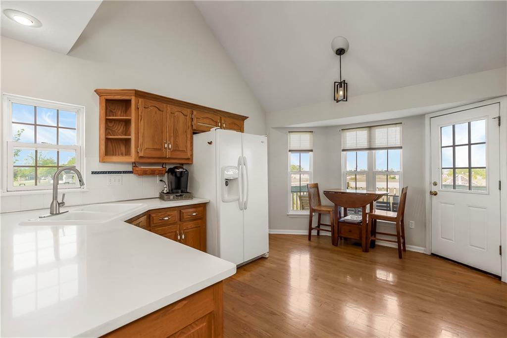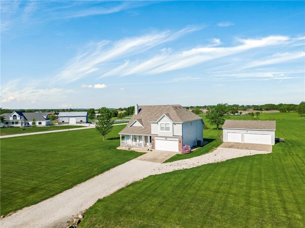 Discover the perfect blend of space, comfort, and country charm with this one-owner home set on 3 acres in sought-after Louisburg Country Estates. Step into the inviting living room featuring soaring ceilings and a cozy fireplace. The spacious kitchen offers quartz countertops, stainless steel appliances, and a generous eat-in area...all opening to a deck that overlooks the meticulously maintained yard. The main level includes two additional bedrooms and a full bath, ideal for family or guests. Upstairs, the oversized primary suite features a custom bathroom complete with a separate shower and soaking tub. The finished lower level provides a large living area, an additional bedroom and bath, and walkout access to a private patio, perfect for entertaining or relaxing. For hobbyists or extra vehicle storage, you'll also enjoy a second 3-car detached garage/workshop. Conveniently located near both 68 Highway and 69 Highway, this property offers peaceful country living with easy access to Louisburg or Overland Park amenities.