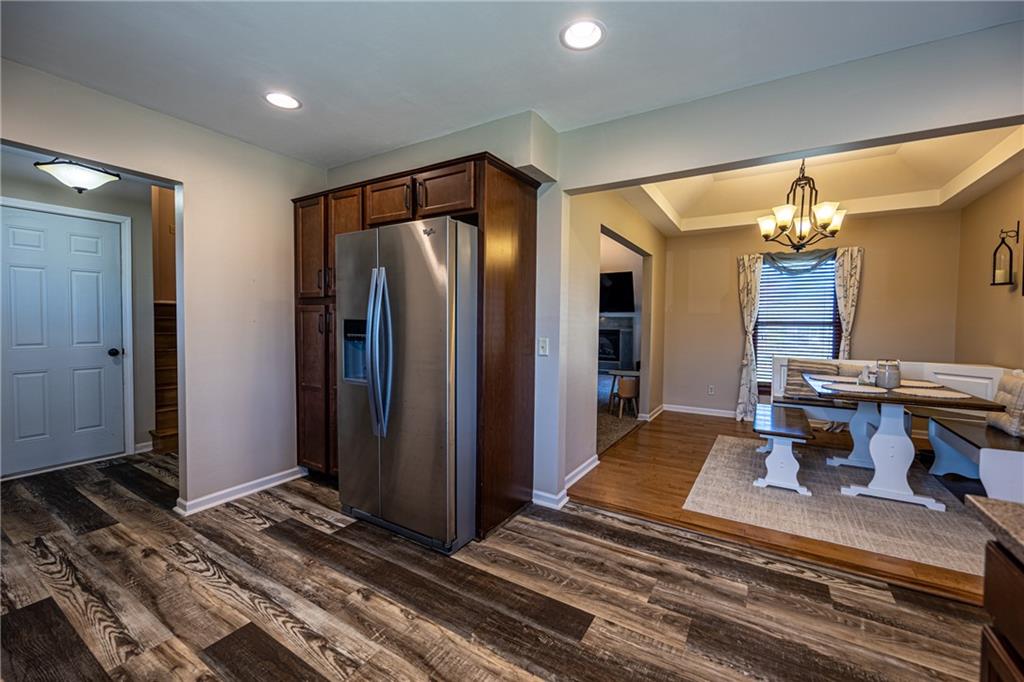 Beautifully maintained split-level with a layout that just makes sense. The main living space features vaulted ceilings with an exposed beam, a fireplace, and great natural light that makes the whole area feel open and inviting. The kitchen and bathrooms have been thoughtfully updated, giving the home a fresh, move-in ready feel. The primary bedroom includes a walk-in closet and its own private bathroom. You’ll also find an oversized 2-car garage, plus additional lower-level space for storage, a workout area, or a second living space. The backyard is fully fenced with a deck and shed, offering a great setup for everyday living or entertaining. The peach trees and lilies really shine in the spring and summer.