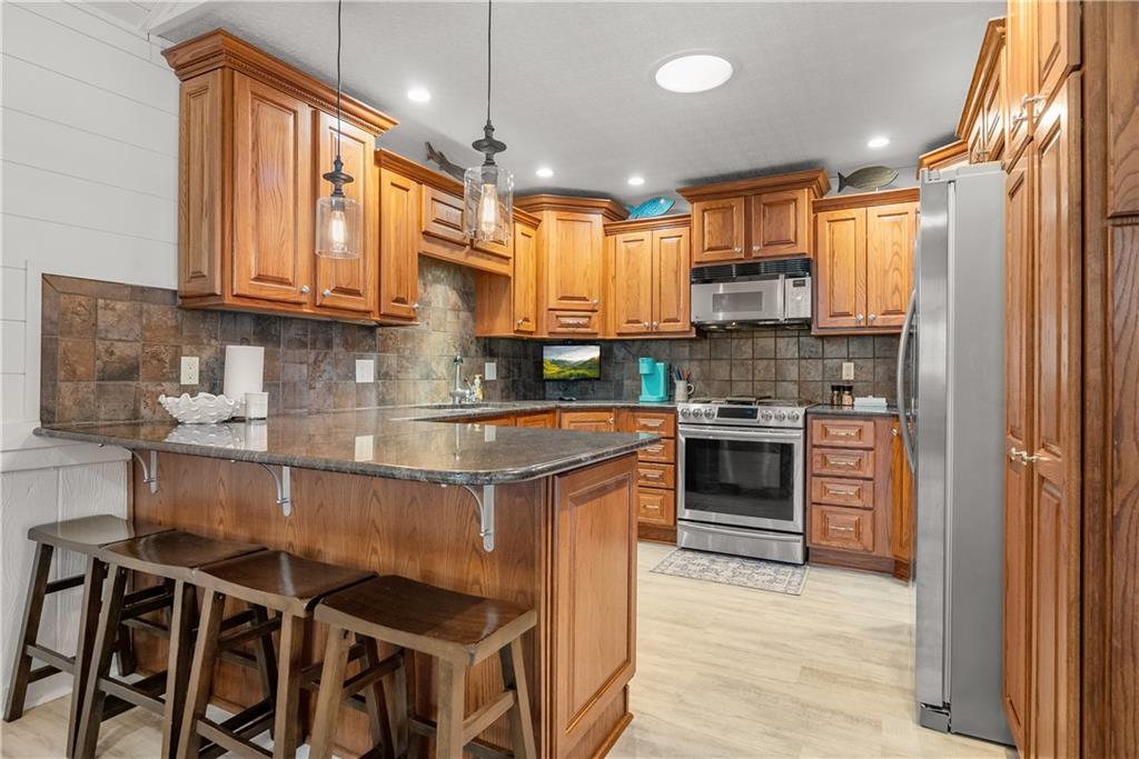 Come live the lake life in this gorgeous 2nd tier home! Enjoy the beautiful view of the lake from the large front porch and relax on the huge, private, treed backyard deck. Plenty of wild life to enjoy around the firepit area. This cozy updated home gives off a lovely beach vibe with adorable ship lap, open floor plan, fireplace, and plenty of storage room in the upstairs attic space. Vaulted ceilings, hardwood and LVP throughout, and the kitchen is a show stopper. Granite, kitchen island and all appliances stay with the home (including the washer and dryer in the oversized laundry room) and a bonus sunroom/office space right off the kitchen with an outstanding view of the backyard. The finished lower level offers a fireplace and full bathroom - could easily be a 4th bedroom area. Roof age 8 years, HVAC 4 years new, hot water tank 3 years new and all suggested foundation work has been completed (see supplements). Completely move-in ready so you can start enjoying the lake life while also enjoying nature in the privacy of your backyard! No dock registered to property but easy access to the lake right down the street.