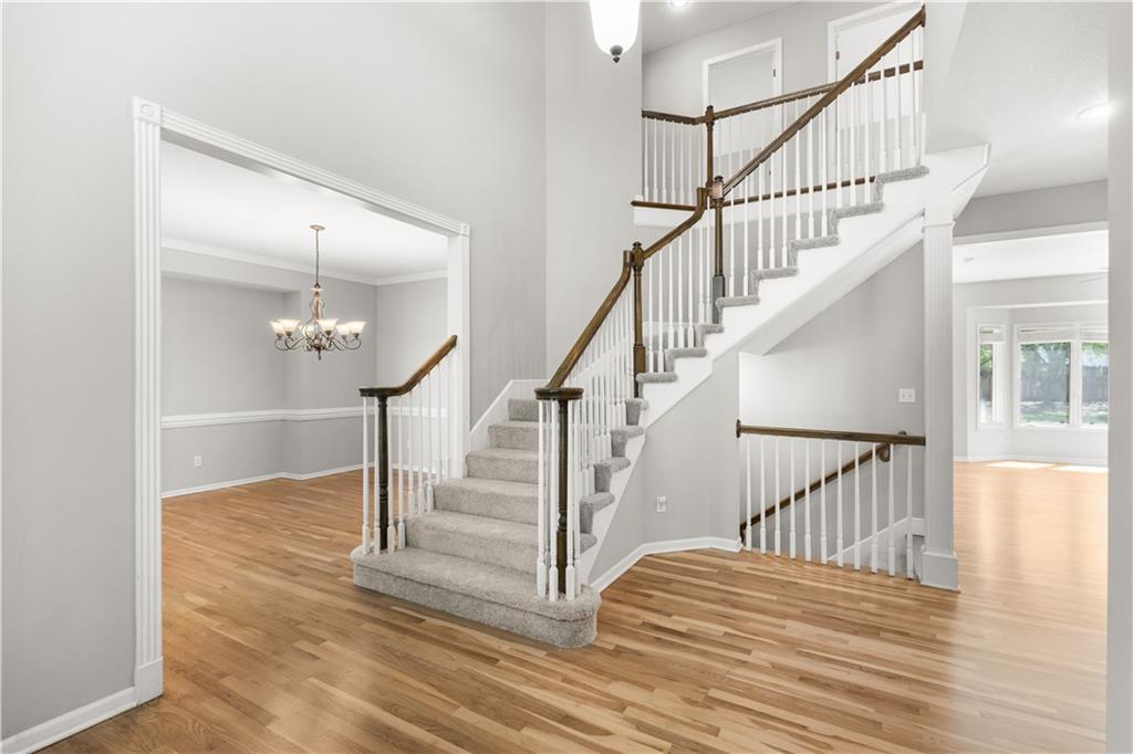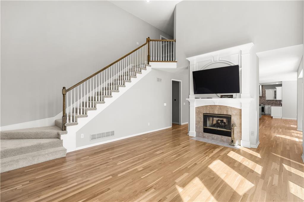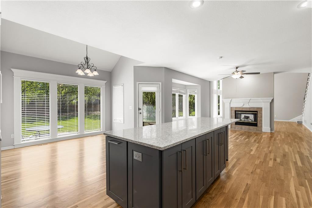 Back on Market with new carpets on the 2nd floor and the stairs. Newly refinished wood floors. Welcome to this beautifully updated home in the highly sought-after Overland Park area, offering the perfect blend of comfort, style, and modern upgrades. Nestled on a quiet street, this spacious residence features an inviting open floor plan designed for both everyday living and effortless entertaining. Step inside to a stunning remodeled kitchen that is truly a cook’s delight—featuring an abundance of cabinetry, quartz countertops, a stylish tile backsplash, stainless steel appliances, and a show-stopping oversized quartz island. The kitchen opens to a generous dining and hearth area, creating the perfect gathering space, and flows seamlessly out to a large patio overlooking a beautiful, level backyard. The main level showcases newly refinished hardwood floors throughout, enhancing the home’s warmth and elegance. A spacious great room impresses with soaring ceilings, a see-through fireplace, and dramatic all-new floor-to-ceiling windows that flood the space with natural light. The inviting two-story entry is flanked by a formal dining room and a versatile den or home office. Upstairs, the expansive primary suite offers plenty of room for a sitting area, along with a walk-in closet and a beautifully updated en-suite bathroom. Three additional oversized bedrooms provide ample space—one featuring its own private updated bath, while the other two share a convenient Jack-and-Jill updated bathroom. The finished daylight lower level expands your living space with a full bathroom and offers plenty of unfinished area ideal for storage or a workshop. With its thoughtful updates, spacious layout, and prime location near top-rated schools, parks, shopping, and dining, this home truly has it all. Don’t miss your chance to make it yours!