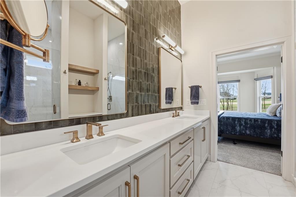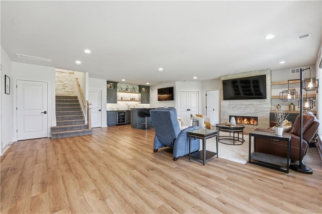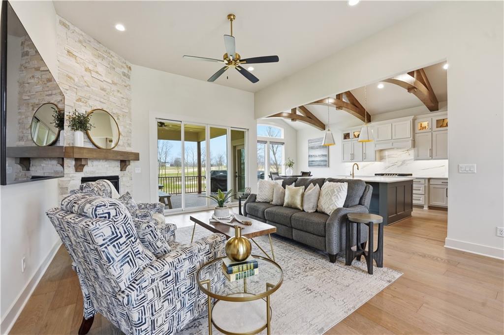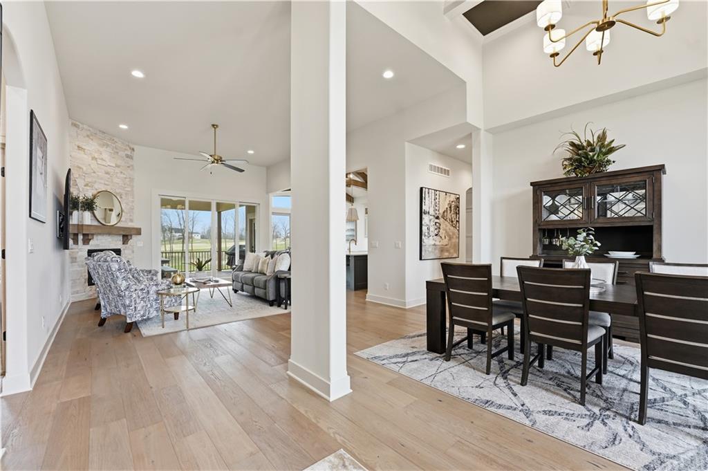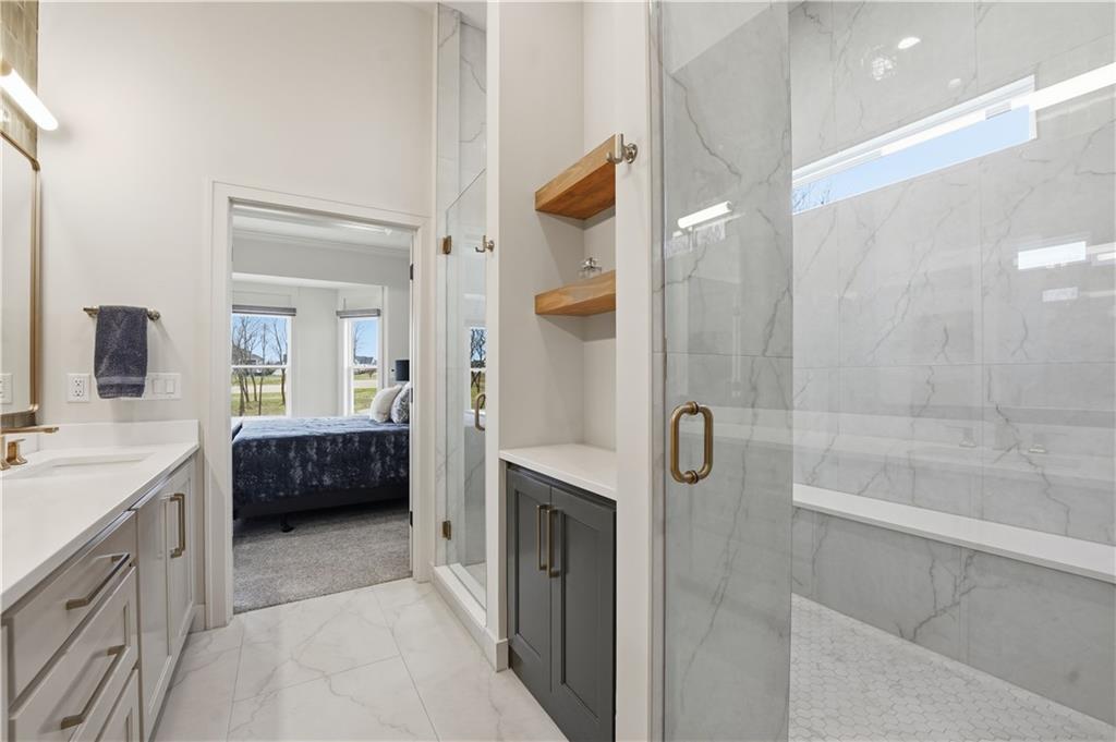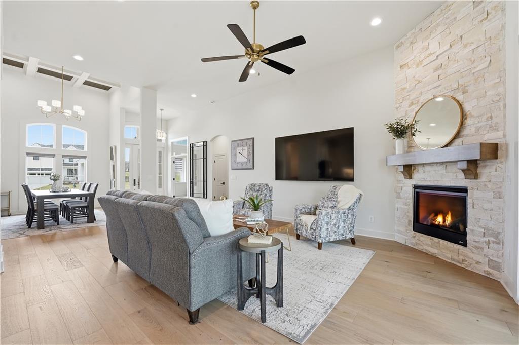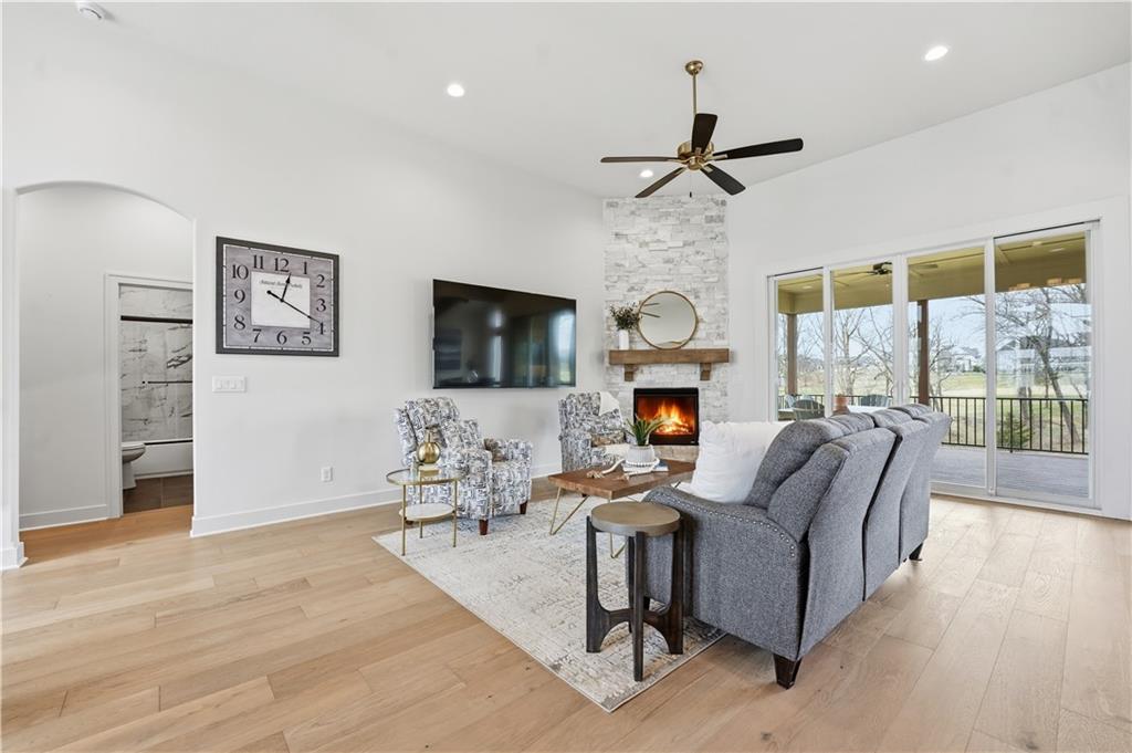 Impeccable finishes and better than new upgrades! Perfectly situated on a quiet cul-de-sac and positioned along the teebox at Shoal Valley Golf Course, this stunning reverse 1.5-story residence, completed in 2025, offers an unparalleled blend of luxury, expansive design, & breathtaking views. Step inside & be greeted by soaring ceilings, abundance of natural light, and exquisite craftsmanship throughout. The elegant open-concept main level is anchored by a beautiful great room featuring a statement fireplace & sliding glass doors that lead to an expanded deck—creating a seamless indoor/outdoor experience while showcasing sweeping golf course vistas & unforgettable sunsets. A dedicated dining room offers an elegant setting for hosting. The kitchen is a true culinary showpiece, thoughtfully designed w/striking wood ceiling beam accents, stunning quartz countertops & island & custom cabinetry. A spacious walk-in pantry & light-filled breakfast area complete this exceptional space. The primary suite on the main level is a serene retreat, positioned to capture peaceful golf course views. The spa-inspired bathroom elevates everyday living w/a luxurious double-head wraparound shower & refined finishes. Two additional BRs & a full bath on the main provide comfort & versatility for family or guests. The WO lower level filled w/natural light is the perfect gathering hub featuring a sophisticated wet bar, adjacent butler’s pantry & family room offering ample space for a pool table/media area. The LL also features a private BR w/full bath, a bonus BR/office & dedicated space for a theater room—ideal for movie nights or game-day experiences. Ideally located in Shoal Creek Valley The Preserve, this home is part of a vibrant lifestyle community offering an array of amenities including shops, dining, neighborhood market, swimming pools, private water park and green spaces! Nearby medical facilities, retail, & convenient highway access, puts everything you need within easy reach.