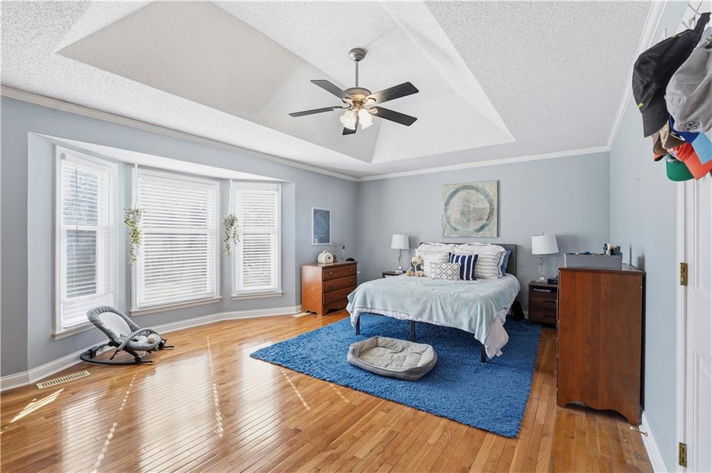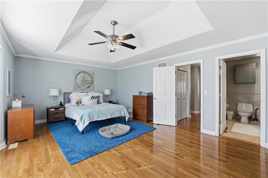 Ideally situated near Little Mill Creek South Park, great location! Gleaming wood floors run throughout the main level and continue upstairs into the hallway and bedrooms, creating a warm, cohesive feel. The main level offers flexibility and function, featuring a spacious living room with classic wainscoting—ideal as a sitting area or home office—alongside a formal dining room with direct access to the back deck. The kitchen is both stylish and practical, showcasing abundant cabinetry, granite and quartz countertops, stainless steel appliances, and a custom island with pullouts and seating. It opens seamlessly to the cozy great room, where a fireplace and built-in shelving create the perfect gathering space.Upstairs, you’ll find four generously sized bedrooms, a charming loft area, and two beautifully updated tiled bathrooms. The primary suite is a standout with its coffered ceiling, dual closets, and a refreshed en-suite bath featuring a tiled shower and floor and vanity with granite top. The finished walk-out basement expands your living space even further, offering the ultimate hangout zone with built-in shelving, a rec area with pool table, half bath, wet bar, and a media space with fireplace. Great opporunity.