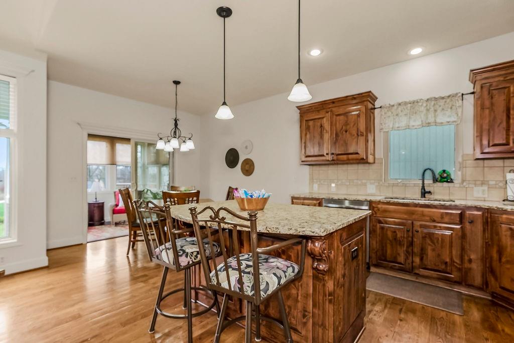 Stunning 4 bedroom, 3 bath reverse 1.5 story nestled on a cul-de-sac, offering a walk-out lower level to a fully fenced backyard. This meticulously maintained home features fresh paint inside and out, new carpet in bedrooms and stairs and newly landscaped grounds — truly move-in ready. The thoughtful layout places the primary suite and a second bedroom and full bath on the main floor, while the lower level offers a second living area, two additional bedrooms, and a third full bath — just the right amount of space for everyone. The open floor plan is packed with modern features and designed for comfortable living and entertaining. At the heart of the home, the kitchen, dining area, and great room flow seamlessly together, anchored by a cozy gas fireplace. The kitchen showcases custom cabinetry, granite countertops, a large island, and a pantry for ample storage. A wall of windows floods the great room with natural light and frames beautiful views of the backyard. Step into the sunroom, an additional 110 sq feet, is just off the dining area — the perfect spot for your morning coffee or evening wind-down, with more serene backyard views. The lower level recreational room walks out to a patio and the fenced backyard, and the property extends beyond the fenced area for added space. Conveniently located near highways, retail, dining, and entertainment — this home truly has it all!