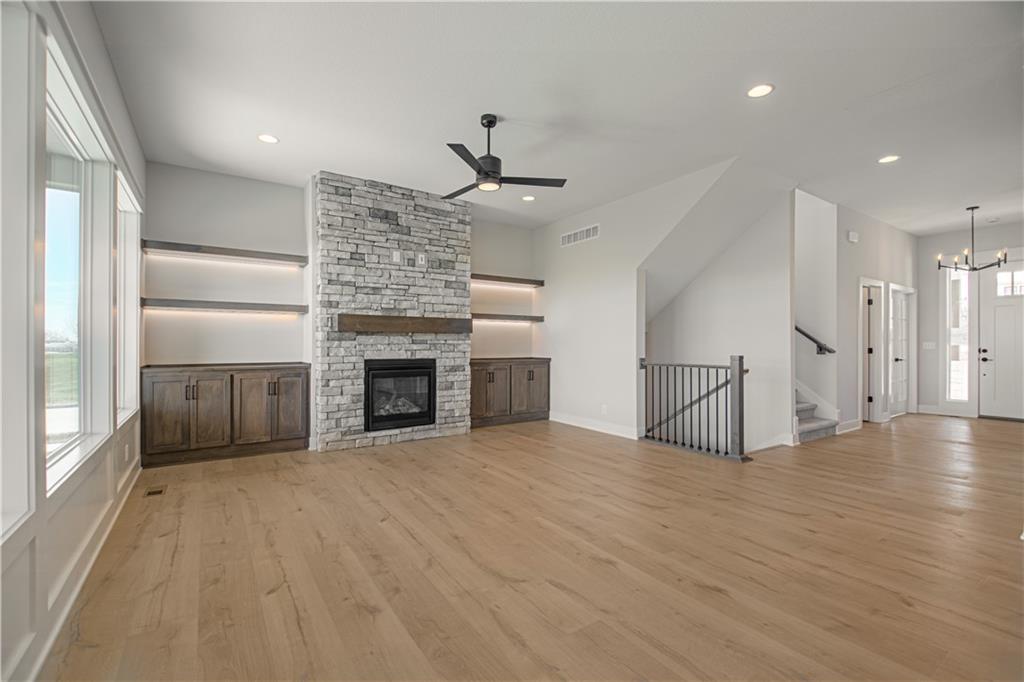 Move-in ready and beautifully designed, The Inglenook by Inspired Homes showcases a striking Craftsman-style exterior on a spacious, flat homesite—perfect for relaxing evenings or hosting BBQs on covered patio. Inside, you’ll find a thoughtfully designed layout with all the spaces you’ve been searching for. Just off the entry, a private home office with French glass doors and a walk-in closet offers both function and flexibility. The main floor features soaring 10-foot ceilings and oversized picture windows that fill the home with natural light. The kitchen is a true centerpiece, complete with high-end finishes including quartz countertops, a deluxe wood hood, built-in appliances with a gas cooktop, upgraded lighting, and under-cabinet illumination. An oversized walk-in pantry provides ample storage, and the kitchen flows seamlessly into the spacious great room, highlighted by custom built-ins, floating shelves, and a stunning stone fireplace. The breakfast area impresses with panoramic views and a custom X-beam ceiling detail. Car enthusiasts will appreciate the rare, oversized three-car garage—large enough to accommodate trucks or full-size SUVs with ease. Upstairs, generously sized bedrooms all include walk-in closets. The primary suite offers a luxurious bath and expansive closet, along with the convenience of second-floor laundry. The FINISHED BASEMENT adds even more living space, featuring a beautifully designed wet bar—perfect for entertaining. Located in the desirable Pryor Ridge community, residents enjoy exceptional amenities including a junior competition-sized pool, playground, basketball and pickleball courts, off-leash dog park, open green spaces, and scenic walking trails. All of this is just minutes from shopping, dining, groceries, entertainment, and easy highway access.