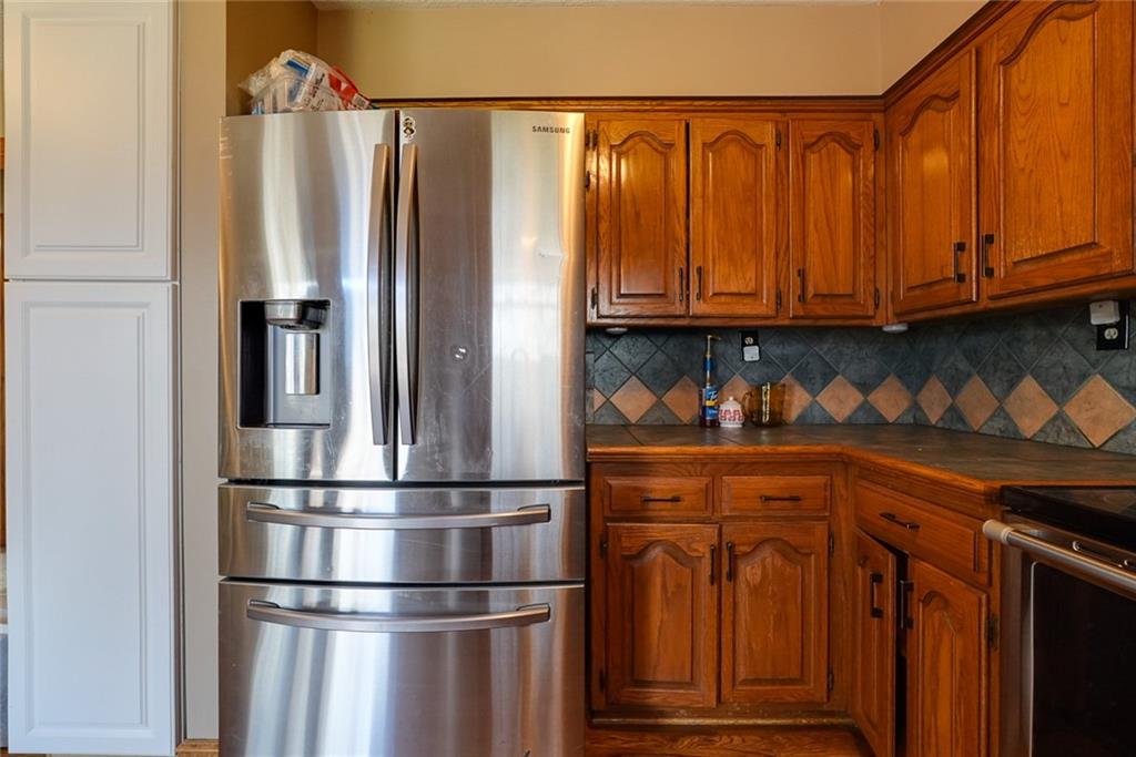 Kitchen with stainless steel appliances, wood finish cabinets, backsplash, and dark countertops