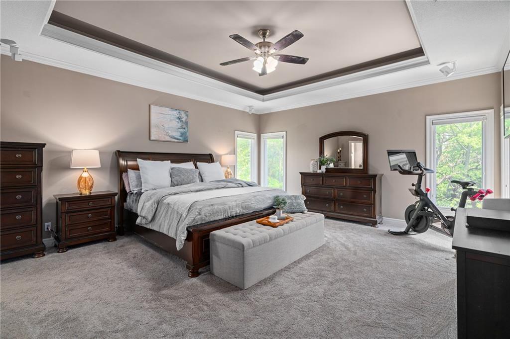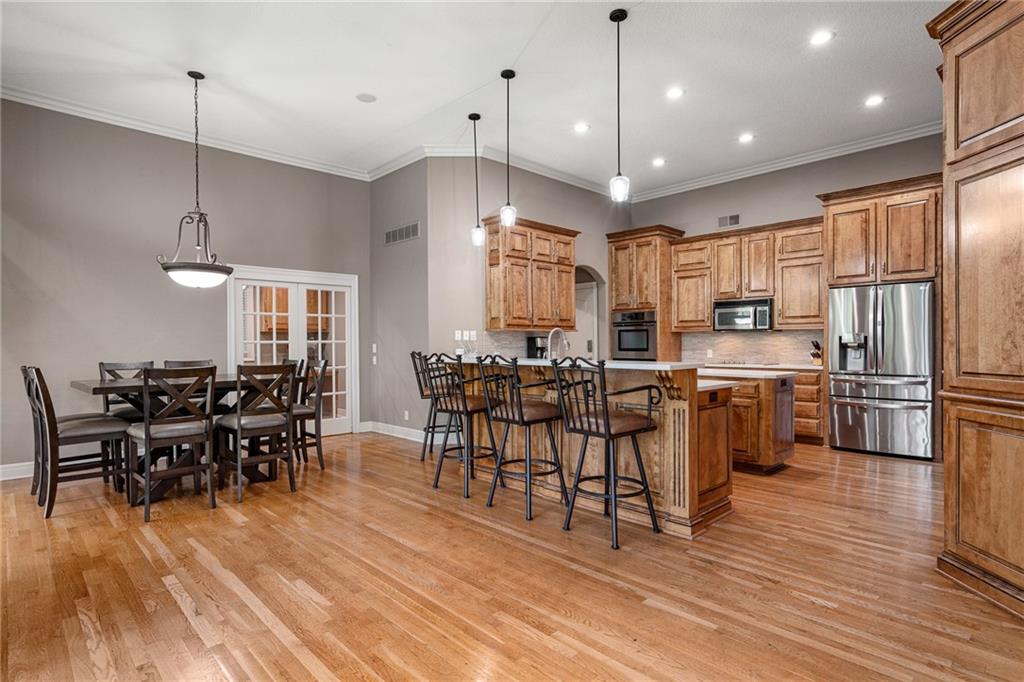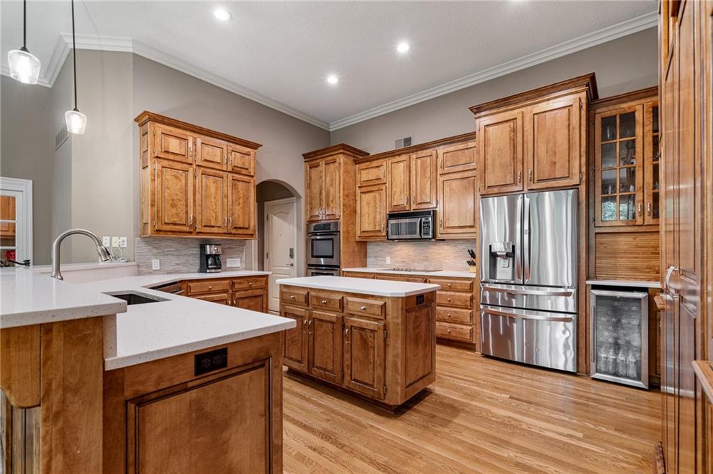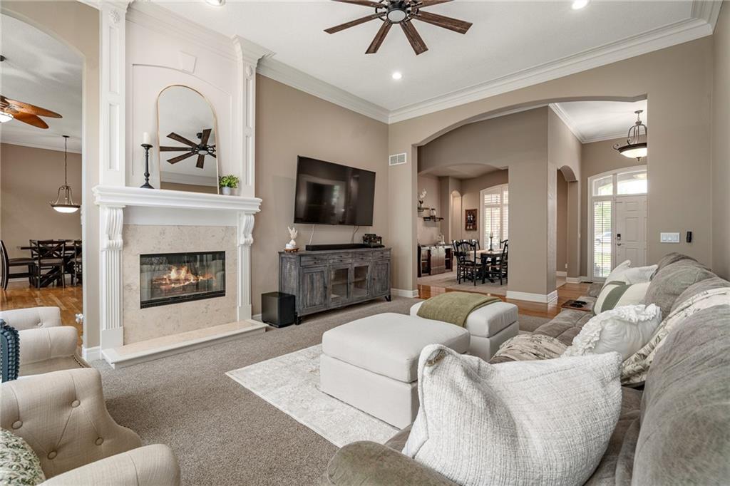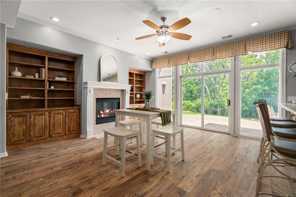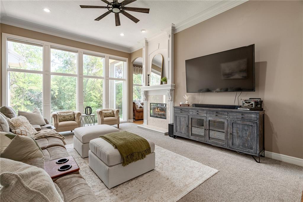 Welcome home to this stunning Don Julian reverse 1.5-story tucked on a wooded half-acre at the end of a quiet cul-de-sac in Woodland Reserve. Soaring ceilings and oversized windows frame peaceful, tree-filled views and fill every room with natural light. The main level offers formal dining, a living room with see-through fireplace, hearth room, home office, and a well-appointed kitchen with custom cabinetry, quartz counters, stainless appliances, double ovens, and walk-in pantry. A four-season sunroom opens to the deck. The primary suite features a tray ceiling, built-ins, and a two-way fireplace into a luxurious en suite bath with heated tile floors, dual vanities, soaking tub, oversized shower, and walk-in closet. A second main floor bedroom with private bath, powder room, and laundry round out the main level. The finished walkout basement includes three additional bedrooms, two with private baths, a family room with fireplace and wet bar, media room, second powder room, and second laundry. The climate-controlled 4-car garage is a dream for hobbyists and car enthusiasts alike. A built-in shed adds even more storage. Enjoy the pool, pond, walking trails, play area, and beautifully maintained common spaces this community has to offer. Tranquil setting just minutes to Oak Park Mall, Lenexa City Center, Shawnee Mission Park, K-7 and I-435.Buyer/Buyer's Agent to verify square footage.