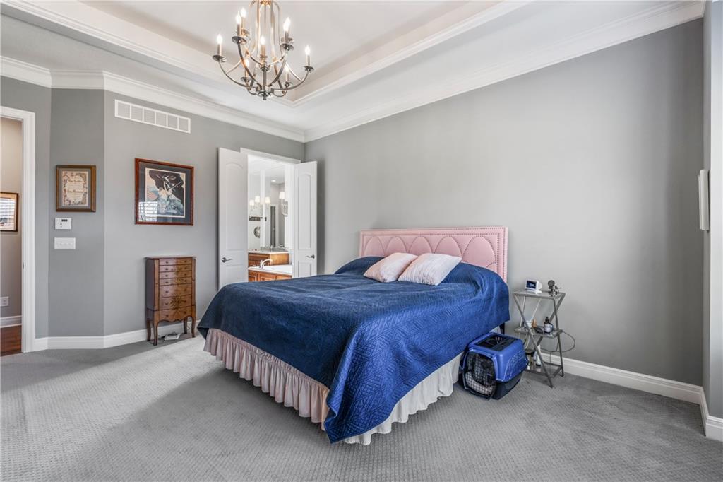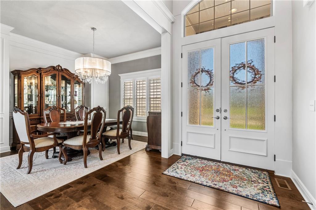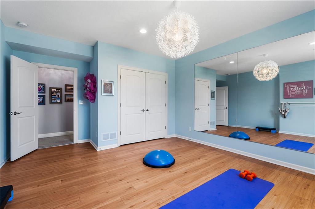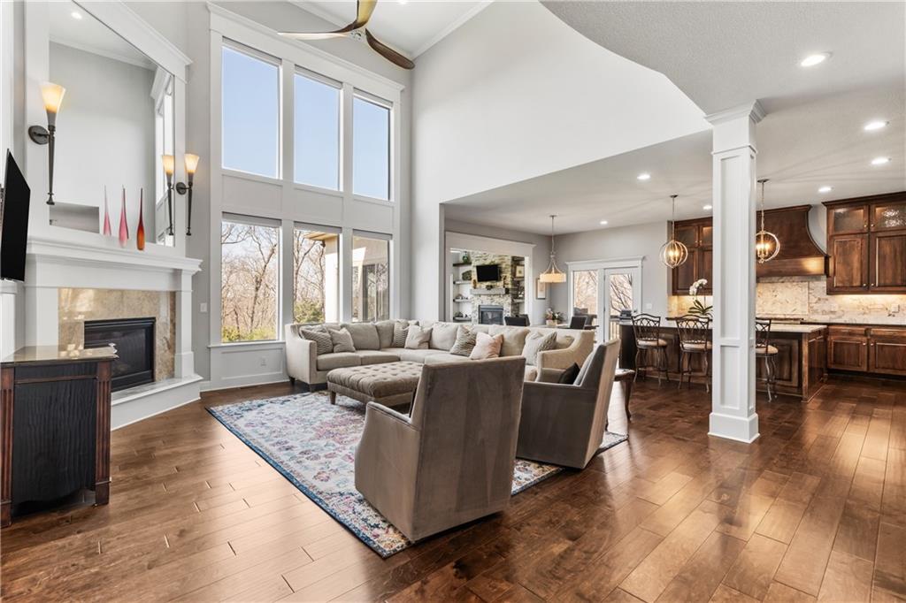Located in the desirable River Ridge Farms West subdivision, this exceptional home is framed by beautifully landscaped grounds and a welcoming front façade that radiates elegance. Set on an estate lot (over half an acre) with open rear views, the home offers privacy and tranquil sunset vistas. A formal dining room off the entry flows seamlessly into the open two-story great room, filled with natural light and anchored by a striking corner fireplace, creating a warm and inviting atmosphere. The chef’s kitchen features granite countertops, a marble backsplash, Thermador double wall ovens, ample cabinet and counter space, and a walk-in pantry. An adjacent dining area opens to a grill deck, perfect for effortless outdoor entertaining, and leads directly into a sunroom with a floor-to-ceiling stone fireplace and built-in shelving—a cozy retreat for morning coffee or relaxing any time of day. The primary suite is a serene haven with tray ceilings and abundant natural light. Its ensuite bath includes double vanities, a soaking tub, and a separate walk-in shower with dual shower heads. Spacious secondary bedrooms each feature their own private bathrooms, and two laundry rooms make daily living convenient. The expansive finished walkout lower level offers versatile living space with a rec room, wet bar, an additional bedroom, and full bathroom. Step outside to a patio overlooking the large backyard, ideal for relaxing or entertaining. A circular driveway provides easy access, and the 4-car garage with extended storage accommodates vehicles, bikes, and more. Located in the highly sought-after Blue Valley School District, this home offers easy highway access and is conveniently close to shopping, dining, and less than 5 minutes to Aubrey Vineyards. Your lifestyle of tranquility and comfort awaits.