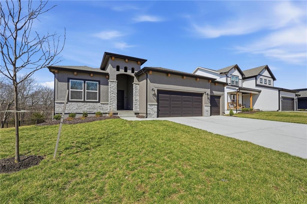 Welcome to 1024 Branchwood Lane in Raymore, a newly constructed home offering a clean, modern feel with thoughtful design and room to grow. This 2-bedroom, 2-bath layout is ideal for those seeking main-level living without giving up future potential. The primary suite stands out with a custom-designed closet that adds both style and everyday functionality. The second bedroom and full bath provide flexibility for guests, a home office, or additional living needs. One of the most valuable features of this home is the unfinished walkout basement. With space to accommodate two additional bedrooms and another full bathroom, it gives you the opportunity to expand your living space over time while adding long-term value. Step outside to a fenced backyard that backs directly to the Creekmoor Golf Course, offering peaceful fairway views and a setting that feels both open and private. Whether you are enjoying a quiet morning or winding down in the evening, the backdrop is hard to beat. This is a rare opportunity to own new construction in a golf course community with the flexibility to grow into the home as your needs change.
