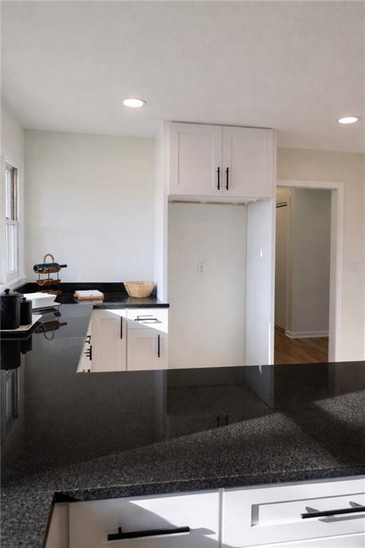Kitchen featuring dark stone counters, white cabinetry, recessed lighting, and a peninsula