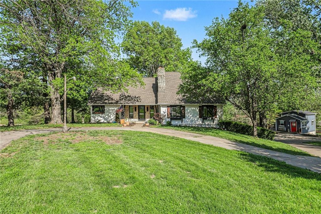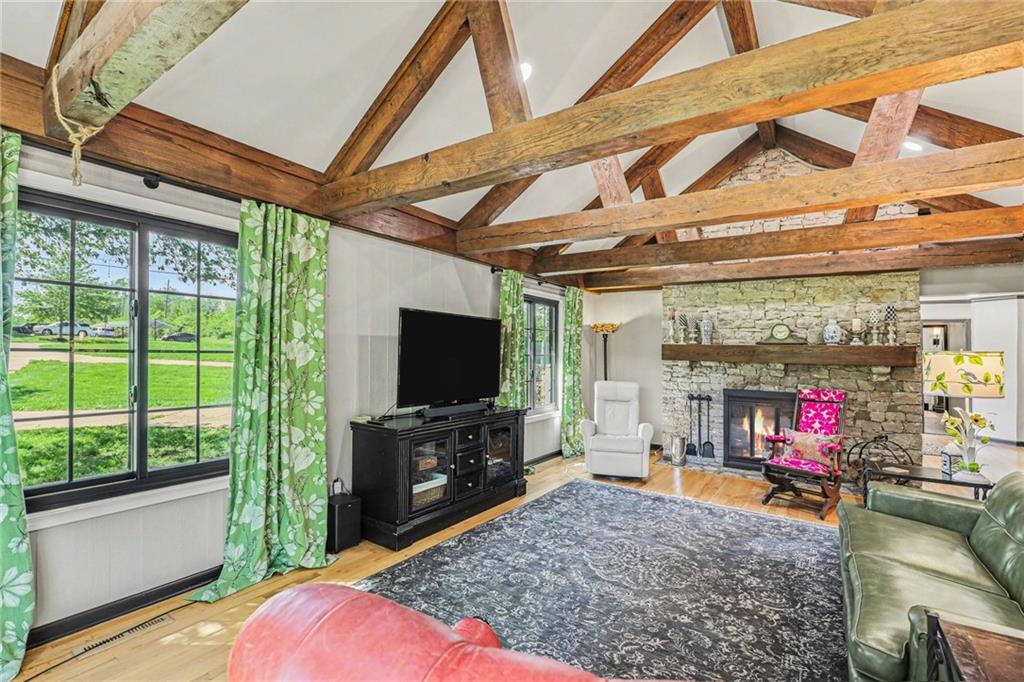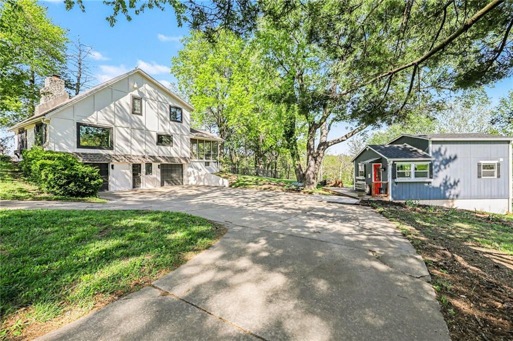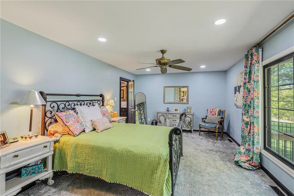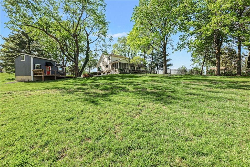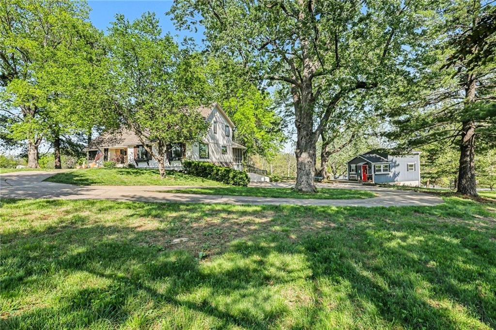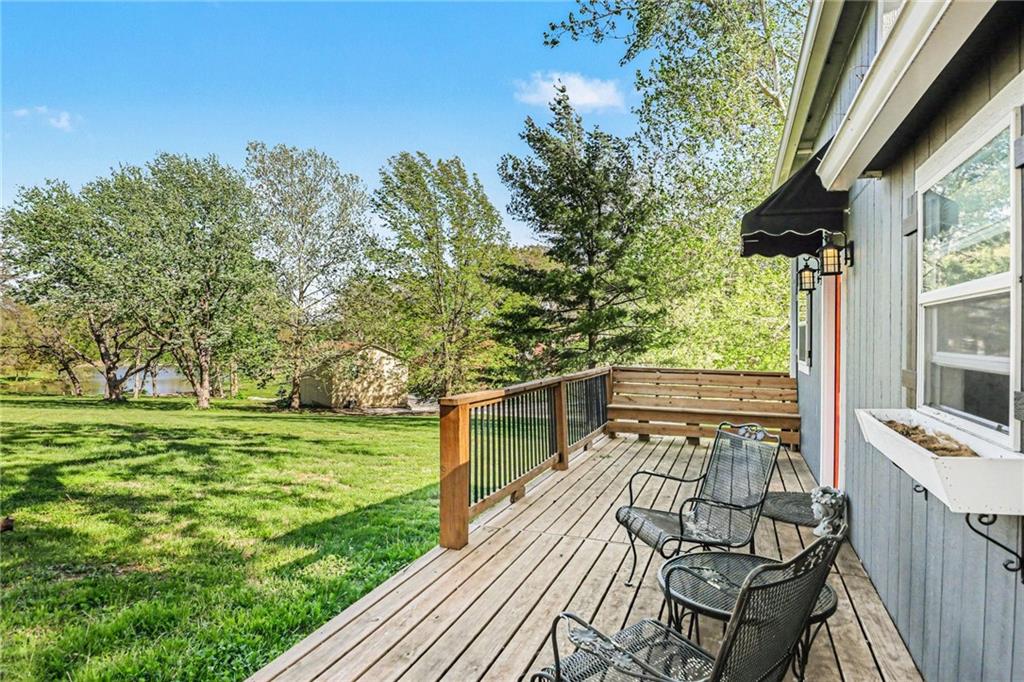 A rare opportunity to enjoy tranquil acreage living within city limits, this beautifully maintained 1.5-story home sits on nearly 5 acres with a shared pond, offering peaceful water views and endless outdoor enjoyment. Featuring 3 bedrooms, 3 bathrooms, and a 4-car tandem garage, this property blends space, functionality, and lifestyle in one unique setting. Step inside to a warm and inviting main level highlighted by vaulted ceilings with exposed wood beams, rich hardwood floors, and a stunning stone fireplace with a gas starter in the living room. The kitchen is designed for both everyday living, featuring custom hickory cabinetry, an oversized island, and abundant storage with convenient pull out shelves. Just off the kitchen, the screened-in porch or the NEW deck both provide the perfect place to relax while overlooking the pond and expansive backyard. The main-level primary suite is a true retreat, positioned to capture beautiful sunrise views over the water with NEW windows. The updated en-suite bathroom features a double vanity with quartz countertops, a fully tiled walk-in shower, and an oversized clawfoot tub and laundry. Upstairs, you’ll find two spacious bedrooms, a full hall bath with updated tile and custom inserts for shower convenience, and an additional flex room ideal for a home office or extra storage.The lower level offers additional storage, full bath, pet spa, mudroom, second laundry, access to the garage and workshop areas. Outdoor living is just as impressive, with open acreage, fruit trees, garden beds, and multiple storage sheds. The shared pond adds to the charm, perfect for fishing. Enjoy the partial NEW fence in the yard perfect for pets. Adding exceptional value, the accessory dwelling unit offers a fully functional space ideal for guests, extended family, or rental income potential. With its combination of scenic views, flexible living spaces, and income opportunity, this property offers comfort, privacy, and convenience all in one.