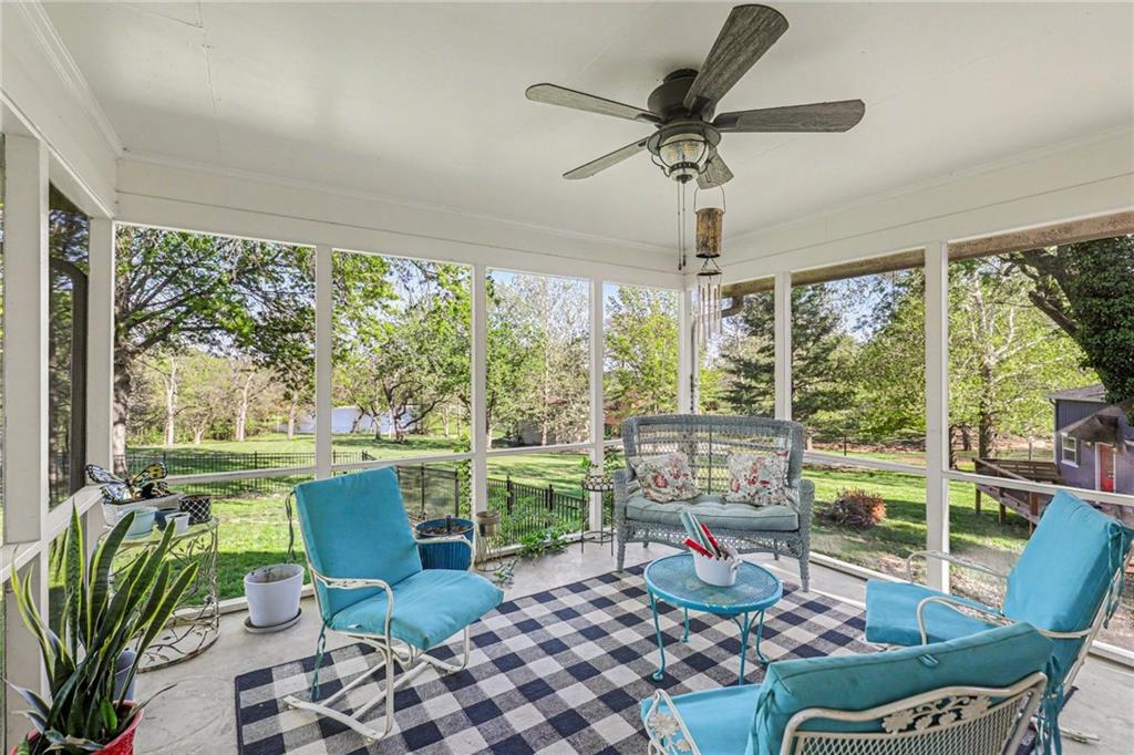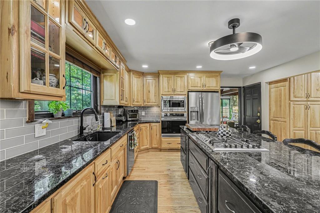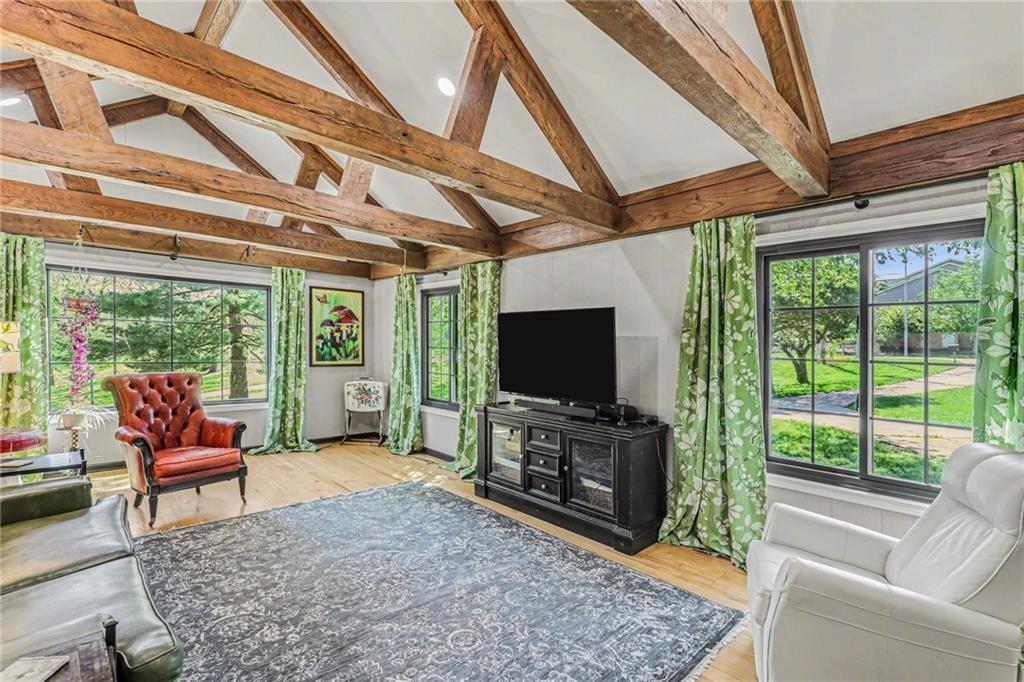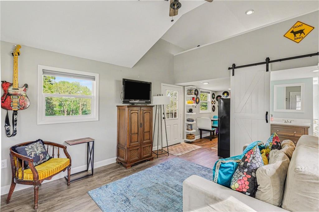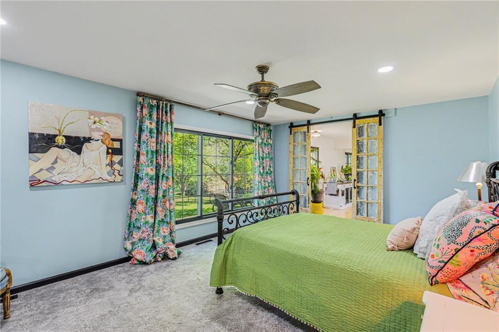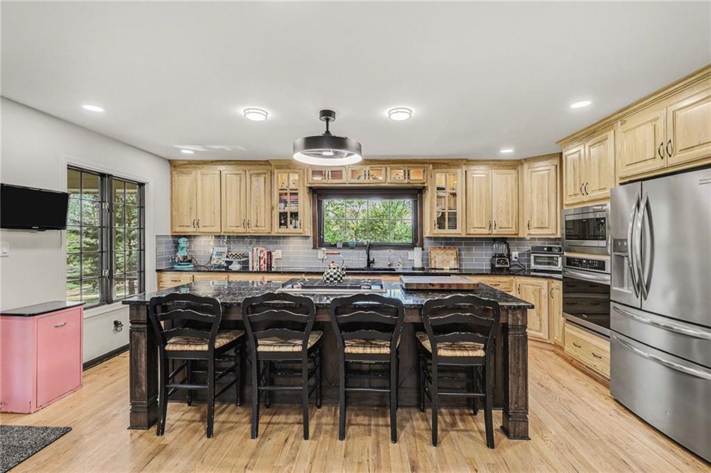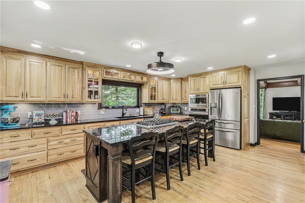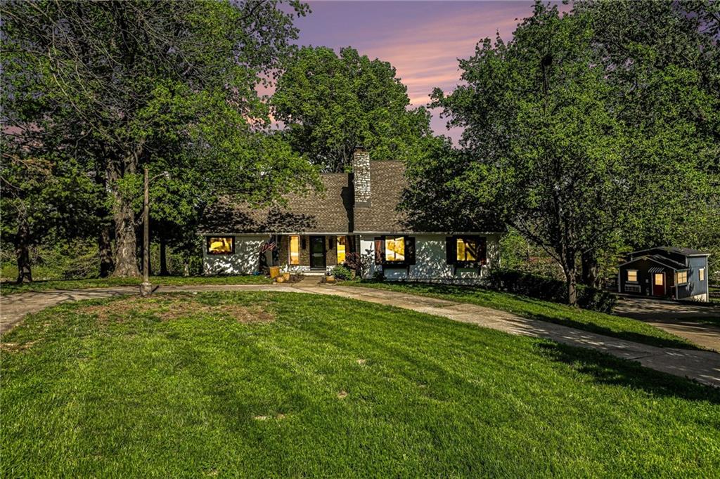 A rare opportunity to enjoy tranquil acreage living within city limits, this beautifully maintained 1.5-story home sits on nearly 5 acres with a shared pond, offering peaceful water views and endless outdoor enjoyment. Featuring 3 bedrooms, 3 bathrooms, and a 4-car tandem garage, this property blends space, functionality, and lifestyle in one unique setting. Step inside to a warm and inviting main level highlighted by vaulted ceilings with exposed wood beams, rich hardwood floors, and a stunning stone fireplace with a gas starter in the living room. The kitchen is designed for both everyday living, featuring custom hickory cabinetry, an oversized island, and abundant storage with convenient pull out shelves. Just off the kitchen, the screened-in porch or the NEW deck both provide the perfect place to relax while overlooking the pond and expansive backyard. The main-level primary suite is a true retreat, positioned to capture beautiful sunrise views over the water with NEW windows. The updated en-suite bathroom features a double vanity with quartz countertops, a fully tiled walk-in shower, and an oversized clawfoot tub and laundry. Upstairs, you’ll find two spacious bedrooms, a full hall bath with updated tile and custom inserts for shower convenience, and an additional flex room ideal for a home office or extra storage.The lower level offers additional storage, full bath, pet spa, mudroom, second laundry, access to the garage and workshop areas. Outdoor living is just as impressive, with open acreage, fruit trees, garden beds, and multiple storage sheds. The shared pond adds to the charm, perfect for fishing. Enjoy the partial NEW fence in the yard perfect for pets. Adding exceptional value, the accessory dwelling unit offers a fully functional space ideal for guests, extended family, or rental income potential. With its combination of scenic views, flexible living spaces, and income opportunity, this property offers comfort, privacy, and convenience all in one.