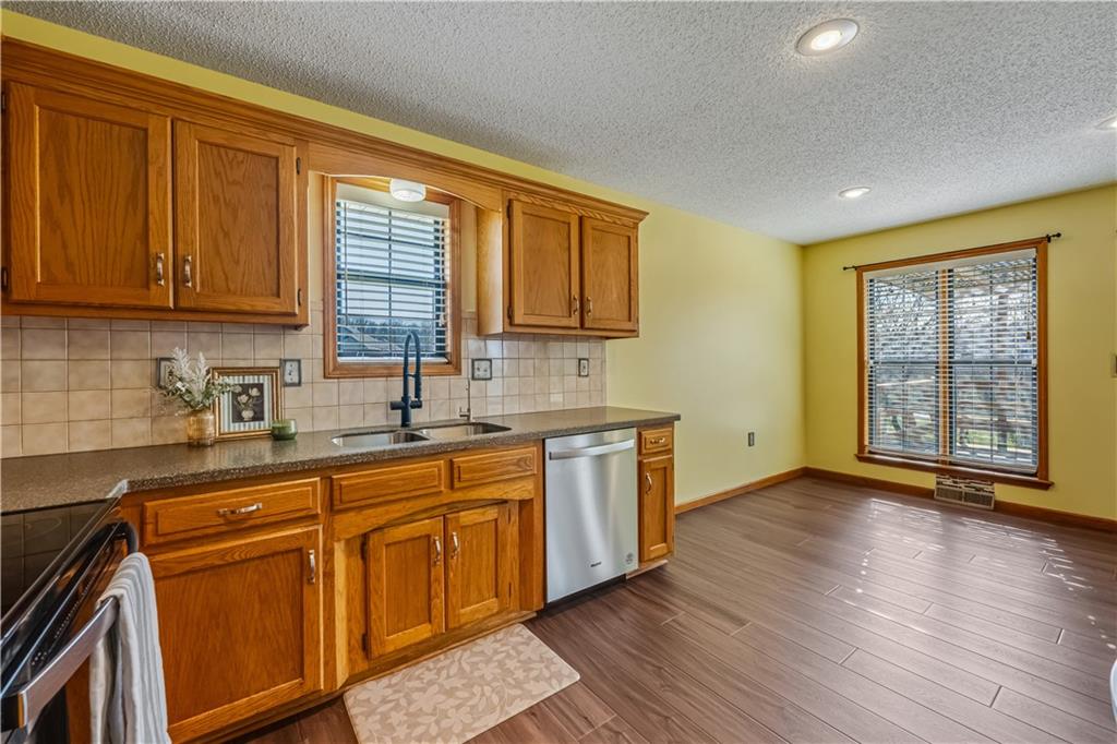 Welcome home! This beautiful home is ready for new memories! Situated on a large corner lot of a cul de sac, within a few minutes of shopping, restaurants, and 50 Hwy for commuting to Whiteman AFB or Kansas City. New wood-look LVP (sellers installed in 2025) runs throughout the main level spaces. The spacious Living Room showcases tall ceilings and a gas fireplace perfect for those chilly winter days. Off the living room is the Kitchen, Breakfast nook and a full Dining Room with lots of natural sunlight. The inviting Kitchen has ample wood cabinets with pantry, solid surface countertops, tile backsplash and stainless-steel appliances that all stay. The main level includes 2 secondary Bedrooms, hallway Bathroom with Laundry, the Primary Bedroom with 2 closets and en-suite Bathroom. Downstairs you will find the Family Room which could be used as second Primary Bedroom with a spacious walk-in closet, an en-suite Bathroom with double sinks and beautifully tiled shower with two shower heads. Head out the patio doors to enjoy time outdoors in the large, privacy fenced back yard (swing set can stay). There is an additional non-conforming room in the basement that would be perfect for an office, 5th bedroom, playroom, etc. You will appreciate the additional storage space in the garage as well as the EV charging station, built-in shelves and workspace. The back deck has new stairs leading down to the newly poured patio extension and storage shed, all added by sellers in 2024. Roof, gutters, and downspouts are just 2 years old! Don't miss out on this wonderful opportunity!