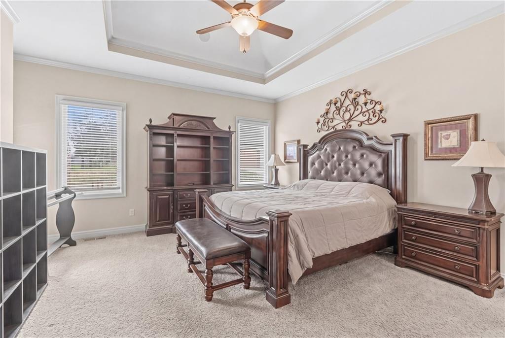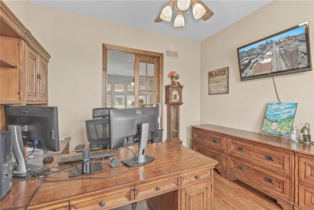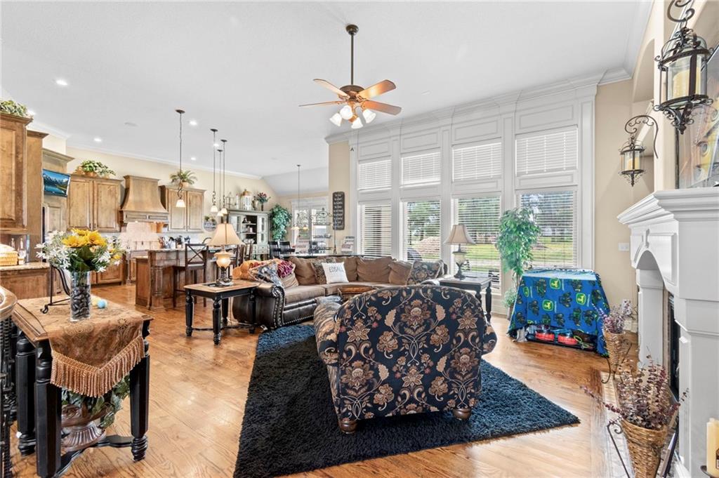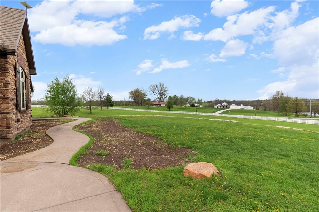 Set on nearly five acres just outside of town, this Kearney estate checks every box and then adds a few you didn’t know you needed. Inside, the main living space opens into a layout that feels open and intentional. The living room, dining area, and kitchen flow together seamlessly, anchored by hardwood floors and natural light. A fireplace with custom built-ins adds a focal point.The kitchen is built for real life and gatherings. Granite countertops, custom cabinetry, double wall ovens, and an oversized island make prep and hosting easy. A walk-in pantry keeps everything tucked away. The main level offers flexibility with a front room that can serve as a bedroom, formal dining space, or office. Two additional bedrooms share a well-designed bath with separate vanity areas. The primary suite is set apart, featuring a large walk-in closet and spa-like bath with soaking tub, tiled shower with dual heads, and double vanity. Laundry and a half bath complete the level. Downstairs, the finished lower level is built for hosting. A full wet bar with a large island opens into a second living area with its own fireplace. A private bedroom and bath make it ideal for guests or multi-generational living, along with a half bath and flexible space for a gym, office, or sixth non-conforming bedroom. Storage is extensive, with a suspended slab design offering approximately 55x31 of storage space, plus an additional 21x11 area that also functions as a secure storm shelter. The six-car attached garage provides plenty of space, and the detached 50x60 shop adds even more with its own office, bathroom, car wash, and paint bay, plus an unfinished upper level. Built with intention, the home features structural beams for wide open spaces, twelve-foot ceilings on both levels, geothermal heating, and energy-efficient windows. Mineral rights convey with the property, including oil and water discovered during the geothermal process and registered with the Missouri Department of Natural Resources.
