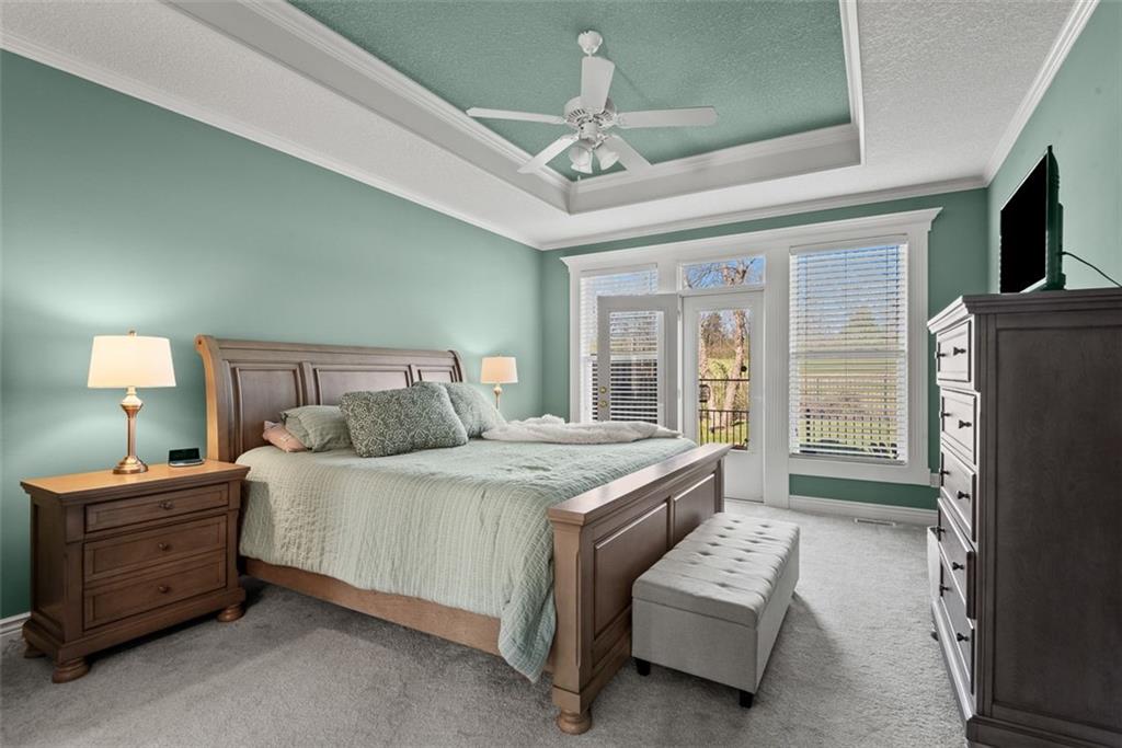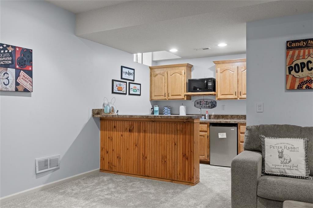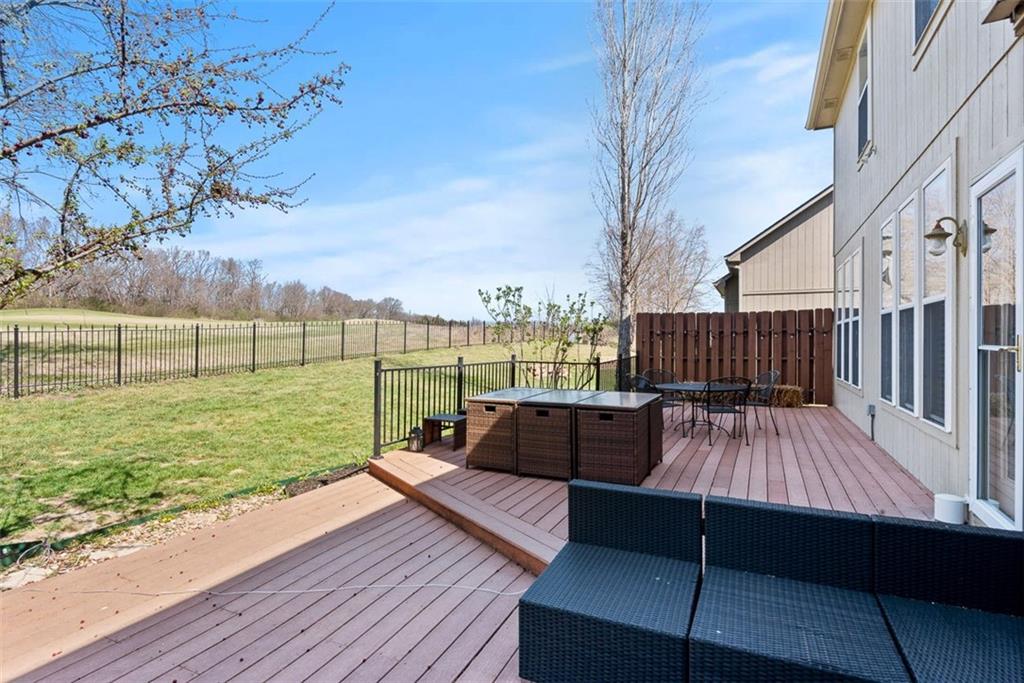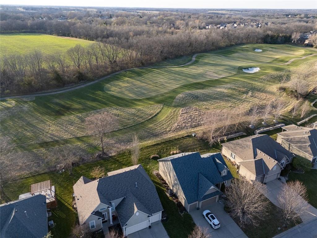 Experience the ultimate maintenance-provided lifestyle in this move-in ready 1.5-story villa perfectly positioned along the 13th fairway of the prestigious Prairie Highlands Golf Course. This thoughtfully designed open-concept floor plan features a rare main-level primary suite with laundry access off the kitchen, a modern kitchen and hearth room, and a formal living area ideal for entertaining. The versatile second-level loft—featuring brand new carpet—serves as a perfect dedicated home office or flex space, while the finished lower-level family room provides additional square footage with a built-in wet bar. Exceptional peace of mind comes with big-ticket recent upgrades, including a newer roof, HVAC system, and water heater. Enjoy serene golf course views from your private deck and a backyard equipped with an underground pet fence. Located in the highly-rated Olathe School District near Lake Olathe Park, this turn-key villa includes a comprehensive HOA covering snow removal, mowing, aeration, fertilization, and sprinkler maintenance, plus access to the community pool, clubhouse, and neighborhood restaurant. Above-ground fences are restricted to maintain the manicured grounds of this premier golf course community. Experience luxury, comfort, and a true lock-and-leave lifestyle in this exceptional Prairie Highlands home!