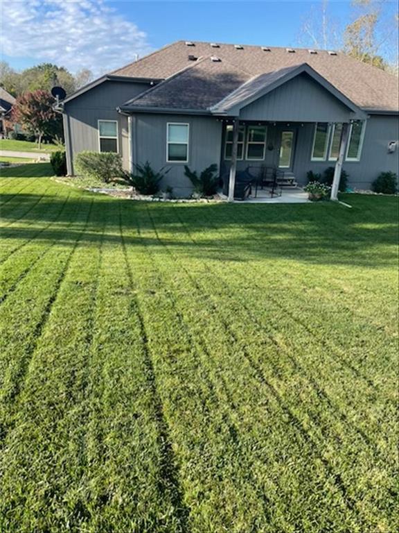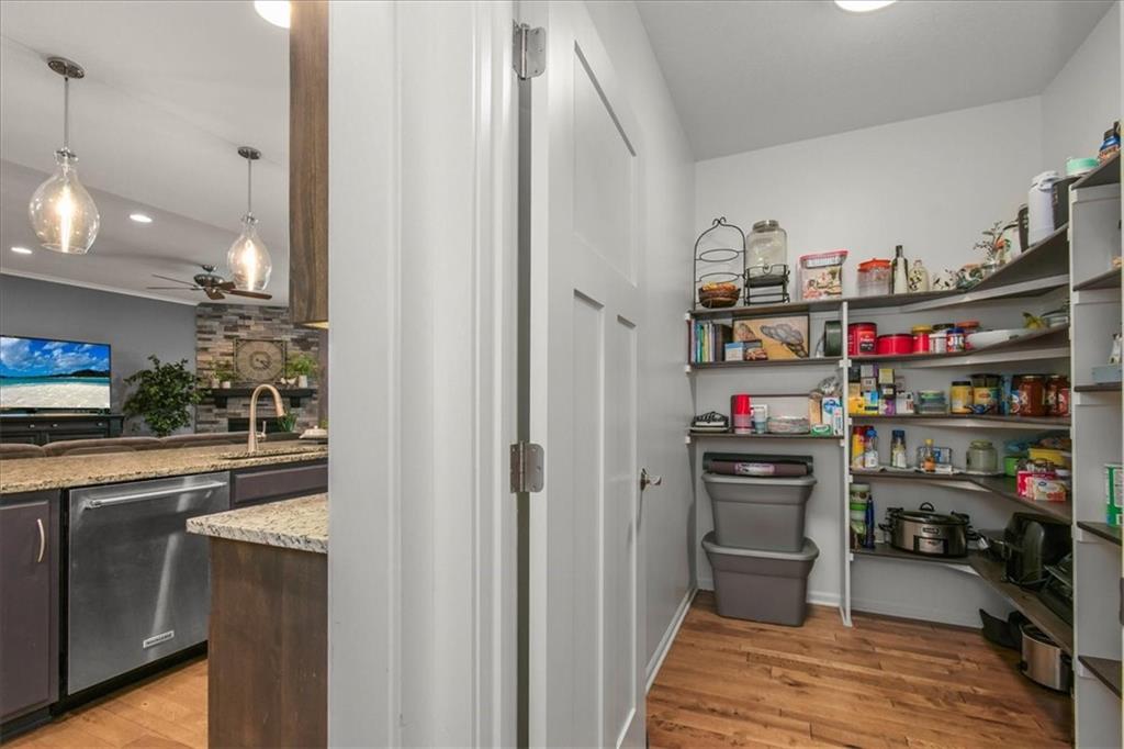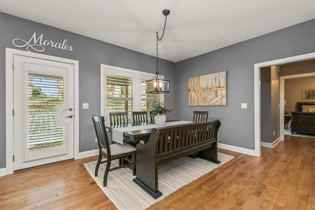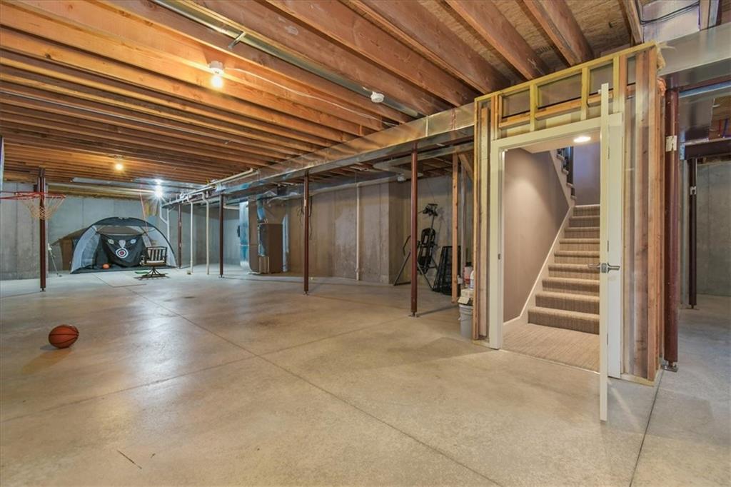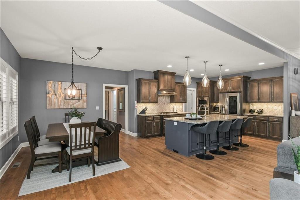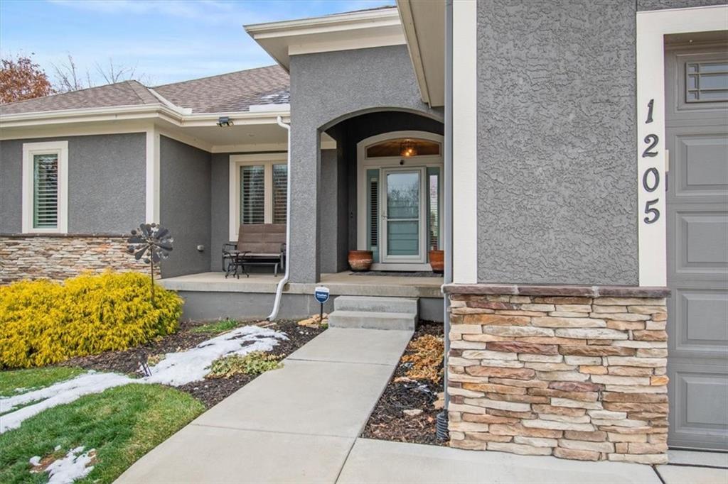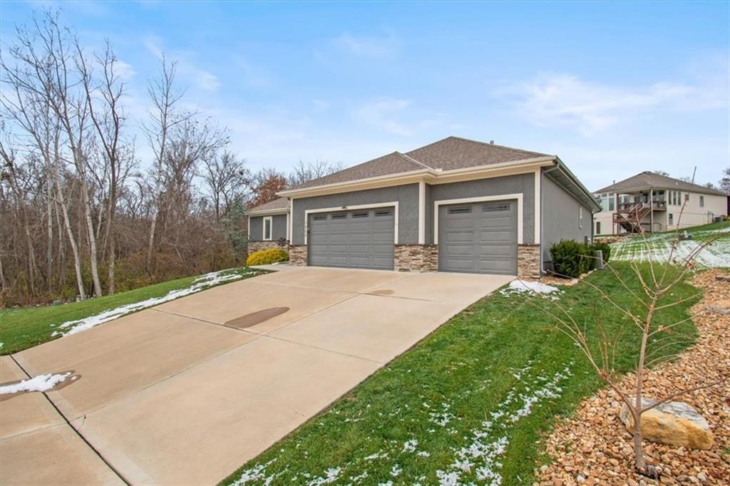 Prepare to be absolutely wowed by this ranch-style architectural masterpiece, a turnkey property where contemporary design meets luxurious, comfortable living. The home immediately impresses with its stunning façade of textured stucco and stacked stone accents, setting a sophisticated tone from the curb. Step inside onto gleaming hardwood floors that guide you through the expansive, open-concept design, flooded with natural light from oversized windows, most accented with custom plantation shutters. The heart of the home is the gourmet kitchen, a true chef's dream, showcasing rich, dark wood cabinetry equipped with soft close cabinets throughout, sleek granite countertops, and a show-stopping dark gray center island with seating—perfect for hosting and entertaining. Transition from the kitchen to the bright dining area and the spacious living room, anchored by a magnificent corner stone fireplace for cozy evenings. Retreat to the main floor private sanctuary in the primary suite, an oasis of calm with a stylish blue accent wall and an elegant tray ceiling that adds grandeur. The spa-like en-suite boasts a sleek double vanity with crisp white cabinetry, a glass-enclosed walk-in shower, and leads into a custom walk-in closet with ample built-in organization. Adding to the home's impressive functionality is a main-floor laundry room with gorgeous dark wood cabinetry, offering maximum convenience, complemented by a central vacuum system. For outdoor enjoyment, step onto the covered back patio, ideal for al-fresco dining or relaxing with a ceiling fan overhead. Below, the vast, unfinished basement presents a phenomenal opportunity to customize and expand—a blank canvas for adding a future home gym, theater, or additional living space to create your ultimate dream home. This is more than a home; it's an uncompromising quality lifestyle awaiting its new owner in a coveted community with excellent highway access for a convenient commute.