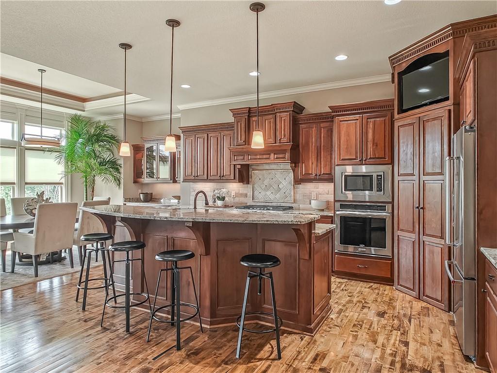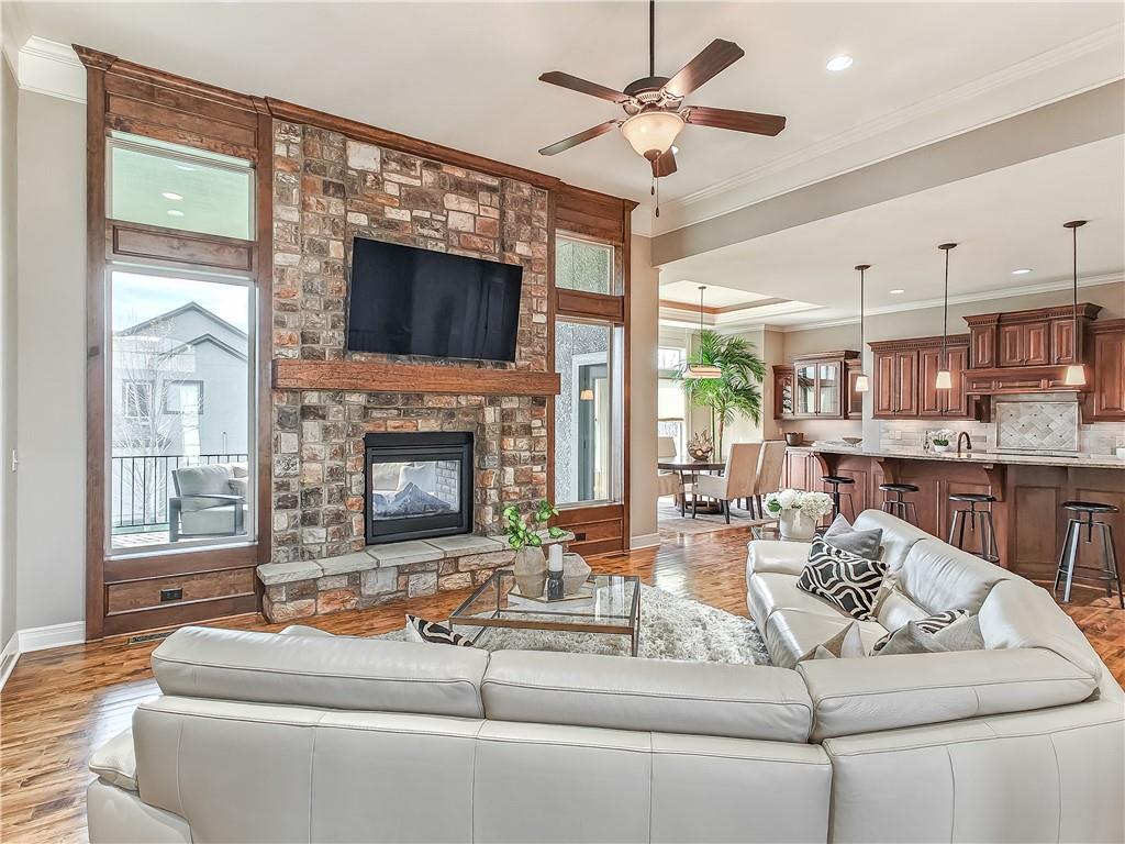 Sensational walk-out reverse 1.5-story in sought-after Polo Fields, offering the perfect blend of open living, thoughtful design, and exceptional functionality. The expansive great room welcomes you with rich hardwood floors and a striking see-through direct vent fireplace, creating a warm connection between the living and entertaining spaces. The open layout flows seamlessly into the kitchen and dining area—ideal for both everyday living and hosting. The kitchen is a true centerpiece, featuring a large island, granite countertops, stainless steel appliances, and a spacious walk-in pantry. A conveniently located laundry room with utility sink sits just off the kitchen for added ease. This meticulously maintained home shines with a massive finished walk-out lower level designed for entertaining and versatility. Enjoy two separate rec spaces, a stylish wet bar with granite countertops, and a convenient half bath. Two additional bedrooms with a full bath provide the perfect setup for guests, family, or flexible living needs, plus abundant storage throughout. Step outside to relax or entertain on the private screened-in covered deck, or take in the outdoors from the lower-level patio—both offering peaceful, usable outdoor living spaces. Additional highlights include: • All stucco exterior for timeless curb appeal • Walk-out lower level • Instant hot water system • Storm shelter for peace of mind • Sprinkler system • Oversized 3-car garage with heaters and high-intensity lighting—perfect for hobbies, projects, or extra storage This home truly delivers space, comfort, and quality in one of the area’s most desirable communities.