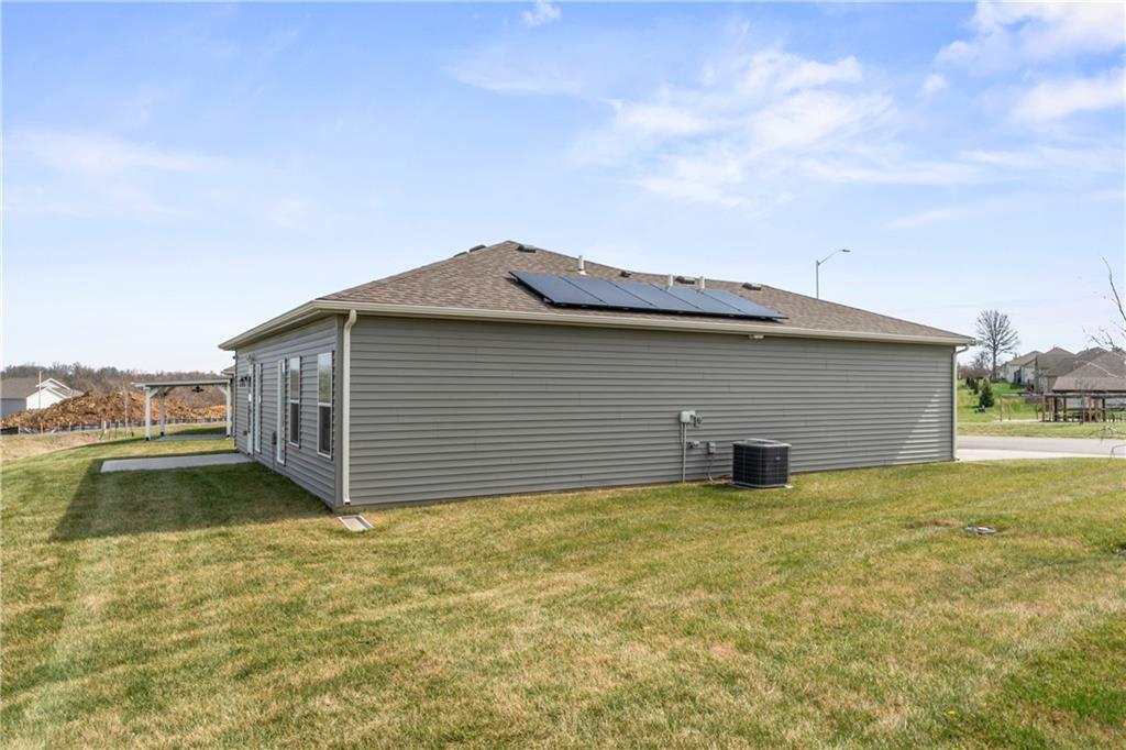 Welcome to 2104 Crestview Place in Raymore’s sought-after Alexander Creek 55+ maintenance-provided community! This nearly new ranch-style home offers the perfect blend of modern comfort, low-maintenance living, and energy efficiency. Built in 2023, this 2-bedroom, 2-bath home features an open-concept layout with a spacious great room that flows seamlessly into the kitchen and dining area ideal for everyday living and entertaining. The kitchen is equipped with granite countertops, a large island, pantry, and stainless steel appliances, all of which stay with the home including the washer and dryer. The primary suite offers a private retreat with a walk-in closet and en-suite bath featuring a double vanity and granite counters. Luxury vinyl plank flooring in main living areas provides durability and style, while neutral finishes throughout make this home truly move-in ready. What sets this home apart is the added value and efficiency: solar panels significantly reduce utility costs (averaging under $20/month), offering long-term savings that new construction often doesn’t include. Additional upgrades include security cameras for added peace of mind. Situated on a desirable corner lot with a sprinkler system already in place, this home also includes lawn maintenance and snow removal through the HOA making it ideal for a lock-and-leave lifestyle. Skip the wait and expense of new construction this home is better than new with appliances, upgrades, and immediate availability. Conveniently located near shopping, dining, and major highways, this is low-maintenance living at its best. Schedule your showing today!