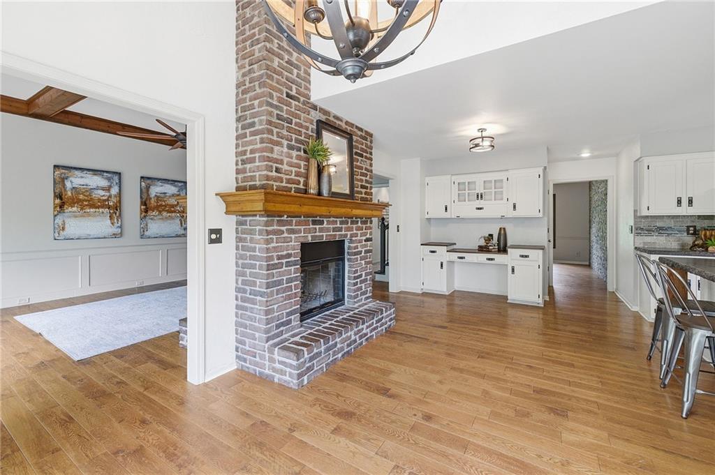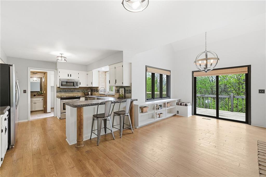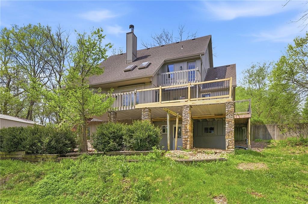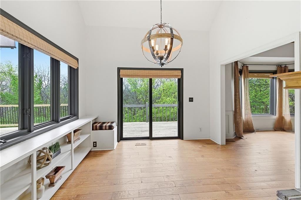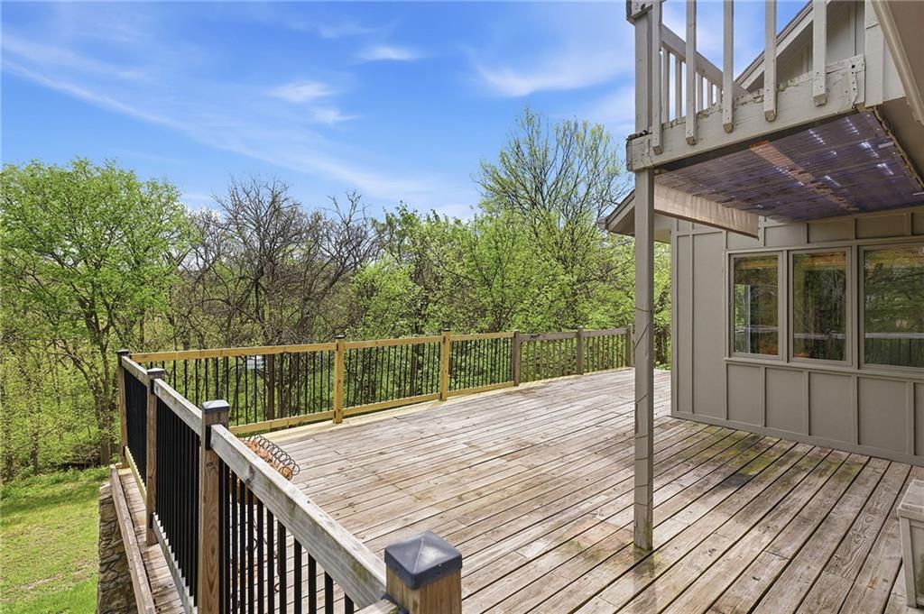 Nestled on a sprawling 1.24 acre wooded lot this stunning 1.5-story home offers the perfect blend of natural serenity, wildlife and sophisticated living. The main level is a host’s dream, featuring a formal dining room, a sunny breakfast area for casual mornings, a cozy hearth room, and large great room all flow together to create the perfect environment for entertaining. Imagine cozy evenings anchored by the fireplace or mornings on your private deck overlooking a peaceful creek and mature trees. The home features a spacious main floor primary suite, while the second level is thoughtfully designed with three large bedrooms, including one complete with its own private bath and walk-in closets. To maximize productivity and versatility, the upper level also includes a dedicated office space, offering an ideal setup for working from home or a quiet study library.The living space extends into a massive walk-out finished basement, providing the perfect footprint for a media room or recreation hub. Beyond the main home, the property is a dream for the hobbyist, featuring a large pole barn perfect for a workshop or additional storage. Located in the award-winning Blue Valley School District, this is a rare opportunity to own a private acreage retreat that perfectly balances grand entertaining with a peaceful, wooded escape. Welcome Home! Taxes and SqFt per county record. Room sizes approx. No preferences or limitations or discrimination because of any of the protected classes under Fair Housing.